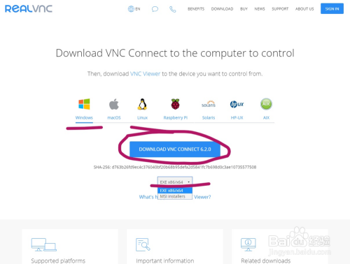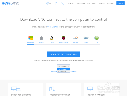 在下载页面里,你可以看到中间第一栏有一系列常用的系统图标,在这里选择要下载的VNC的工作环境,默认已经选择了Windows系统,可以根据需要选择不同的操作系统,这里我们选择Windows即可;第二栏为下载按钮,这里默认下载版本为最新的版本6.2.0,点击即可开始下载;在第三栏中,可以选择安装包文件的格式,可以看到有EXE、MSI两种格式的文件,均为Windows下的安装包文件格式,这里默认为EXE,一般选择EXE即可。