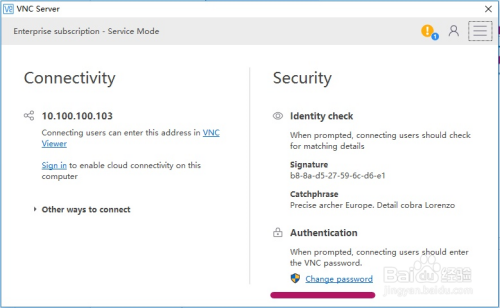 然后进入主界面,可以看到左边 Connectivity 板块为连接相关的信息,显示目前的服务器端IP为10.100.100.103;右边为 Security 为安全相关信息,上边 Identity check 为一些身份检查等信息,下方 Authentication 为认证信息。