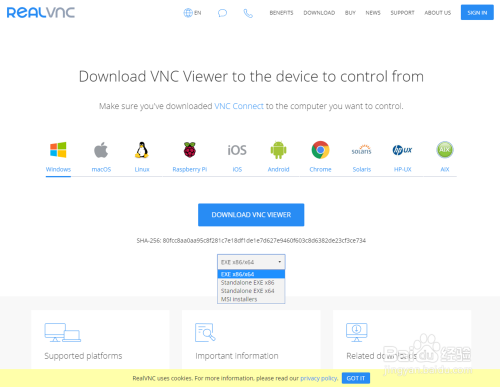 下载页面跟之前的相似,就不再介绍了。可以看到下载页面中可以进行下载项的选择,首先是 VNC Viewer运行环境的选择,默认选了Linux,这里我们选择 Windows,然后下边的选项也会变成Windows对应的选项,在第三栏里选择安装包文件类型,选择 EXE x86/x64 即可。