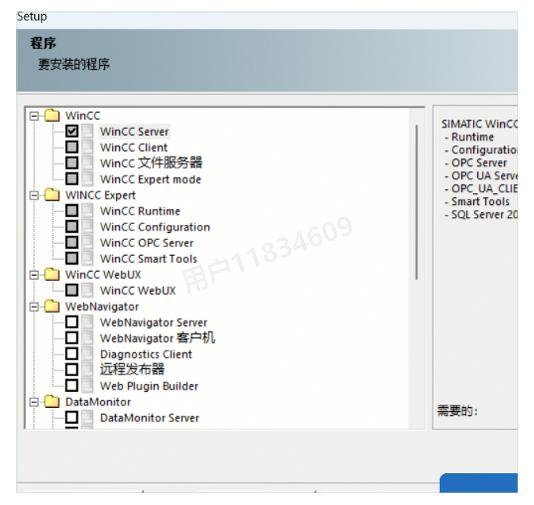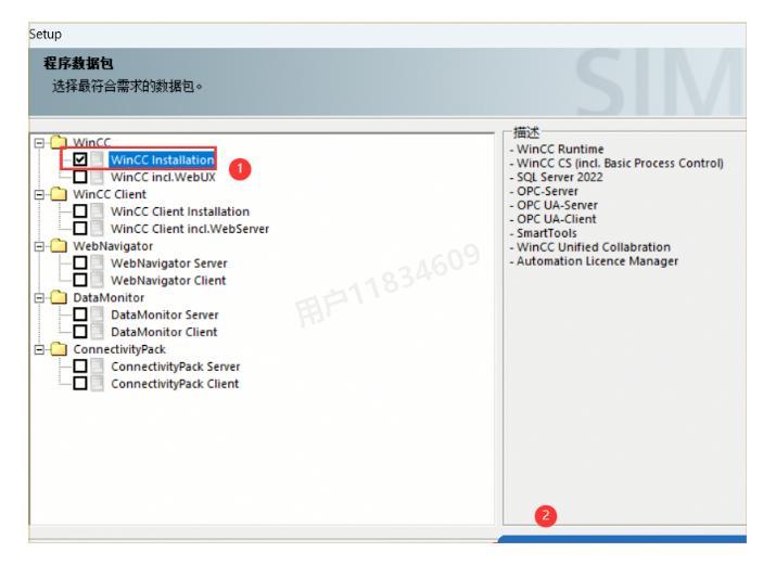 14、在组件选择页面,确保勾选【WinCC Installation】选项,然后点击【下一步】