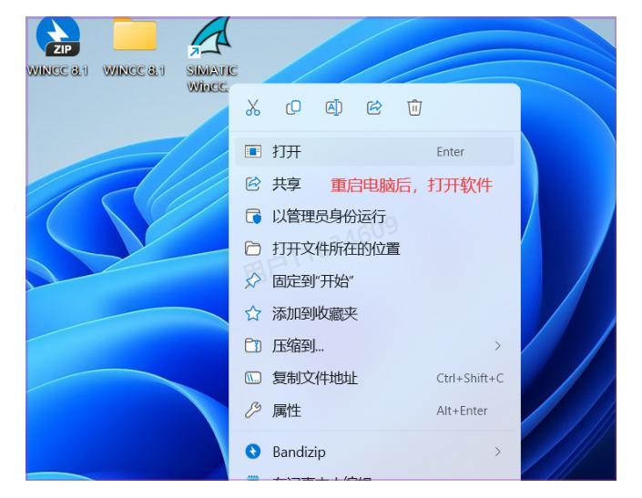 34、现在是最关键的一步!重启电脑让所有配置生效,然后回到桌面,找到【SIMATIC WINCC 8.1软件图标】,右键点击【打开】
