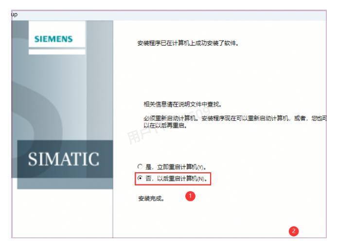 19、安装完成后,勾选【否,稍后重新启动计算机】选项,然后点击【完成】(我们还有后续步骤需要完成)