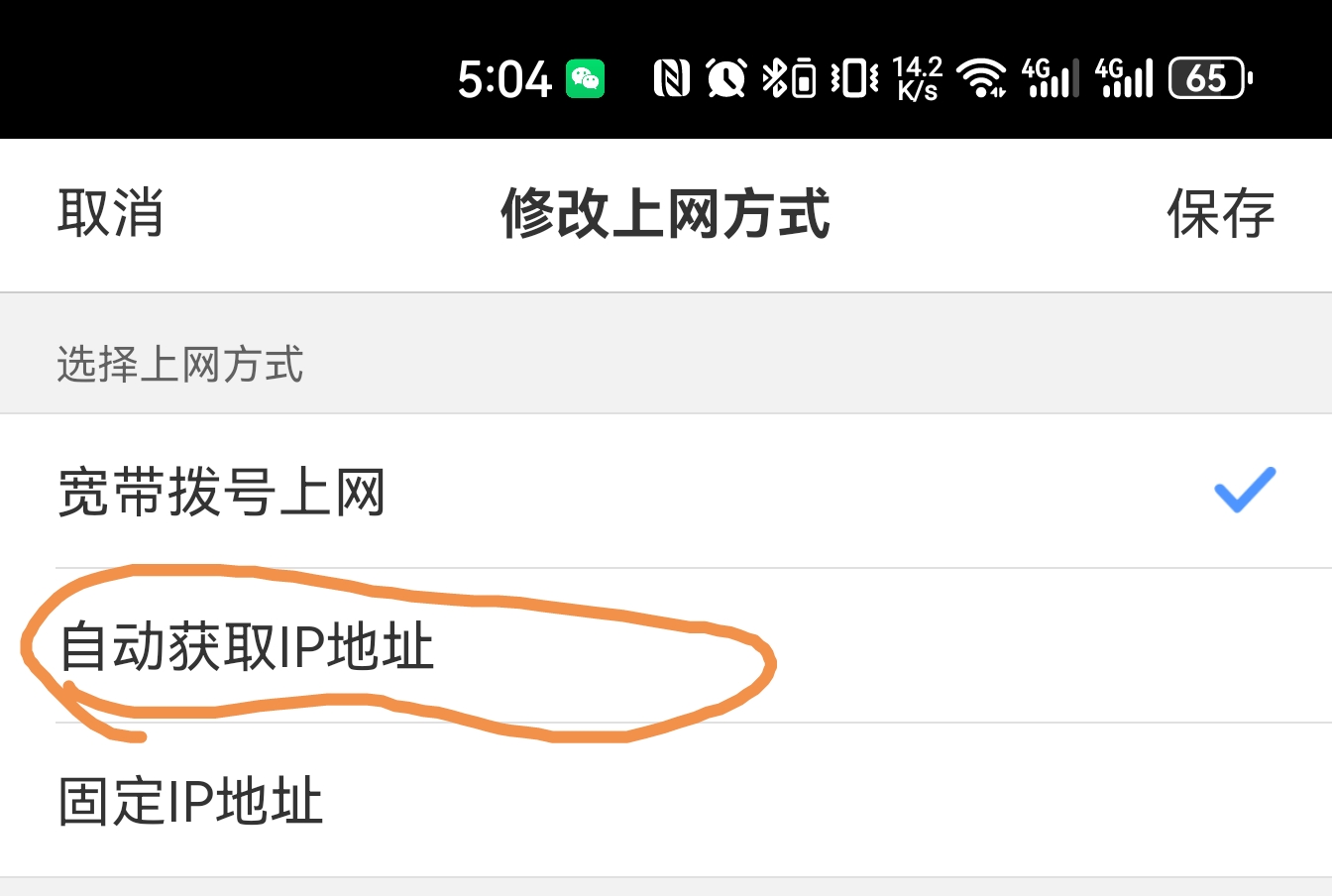 tips:这个地方要注意的是,如果你光猫设置的不是dhcp自动获取地址,这种方法可能不会管用,就需要你将上网方式更改为 固定IP地址 ,更改到和你给光猫设置的网段一致即可,切记不要IP地址冲突。