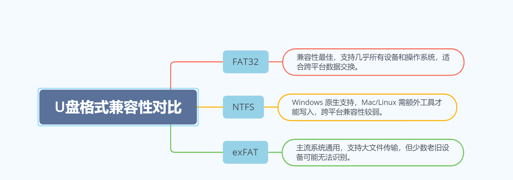 盘格式类型的选择会直接影响到 U 盘的性能表现、兼容性以及数据存储的安全性和便利性。选错格式可能会导致大文件无法存储、在不同设备间无法正常读写,甚至影响 U 盘的使用寿命 。今天就来给大家分享U盘三种格式相关的知识,希望对大家提供一些帮助!