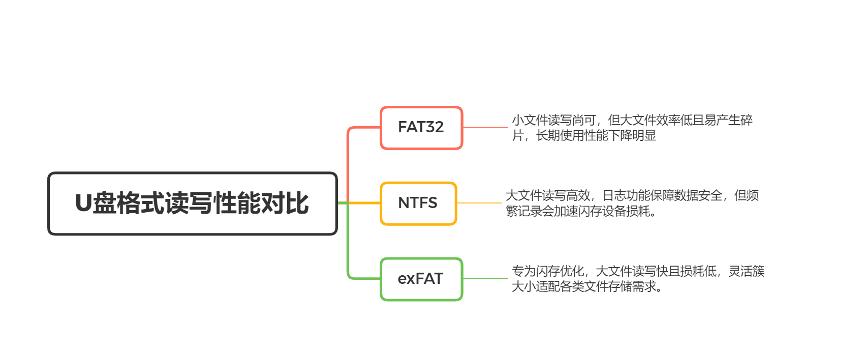 FAT32 : 小文件读写尚可,但大文件效率低且易产生碎片,长期使用性能下降明显。