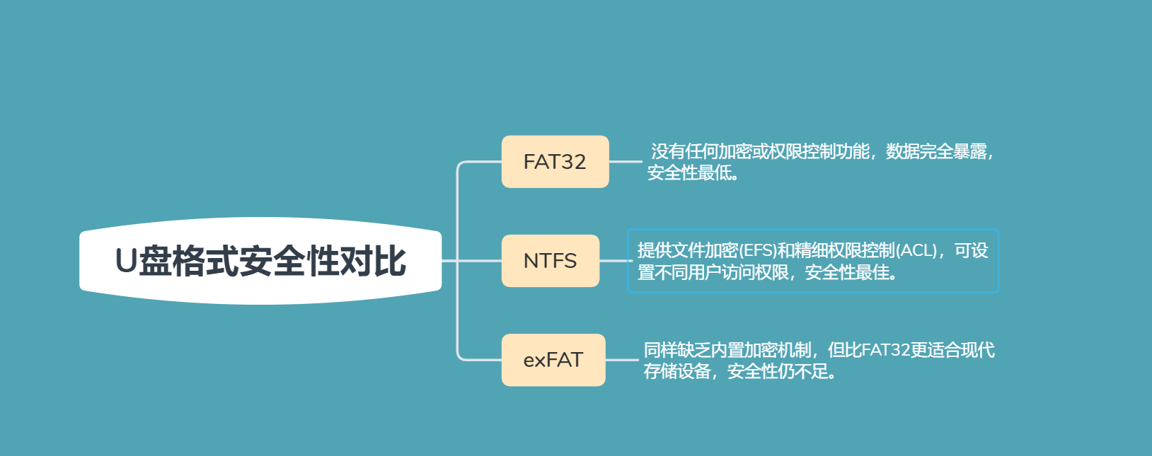 FAT32: 没有任何加密或权限控制功能,数据完全暴露,安全性最低。