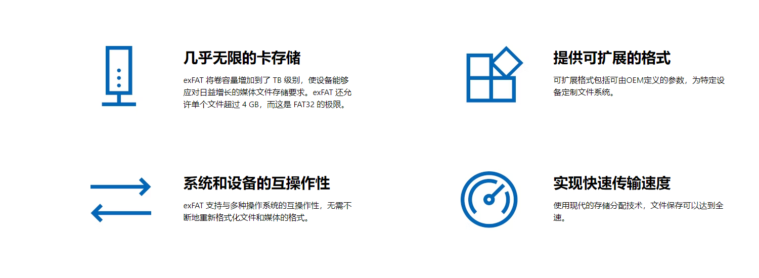 exFAT : 专为闪存优化,大文件读写快且损耗低,灵活簇大小适配各类文件存储需求。