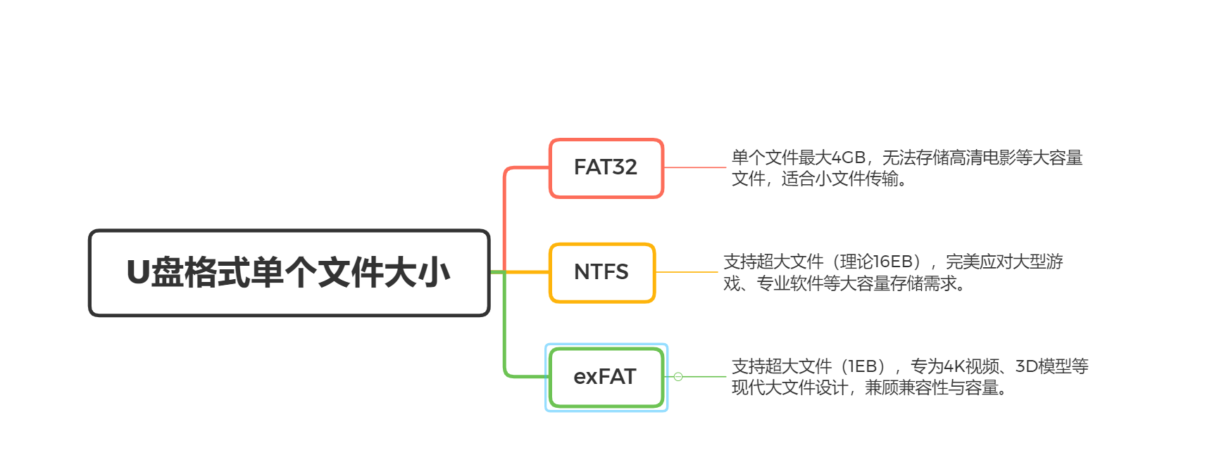 FAT32 : 单个文件最大4GB,无法存储高清电影等大容量文件,适合小文件传输。
