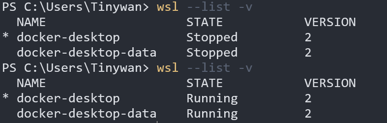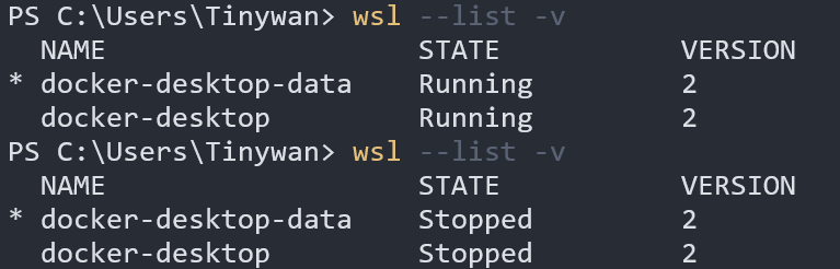 首先需要做的是停止Docker desktop应用进程,进程停止之后,使用wsl --list -v命令查看WSL中的运行的实例是否停止。