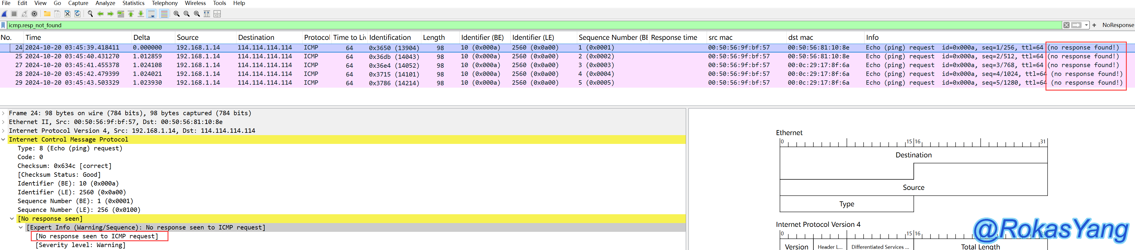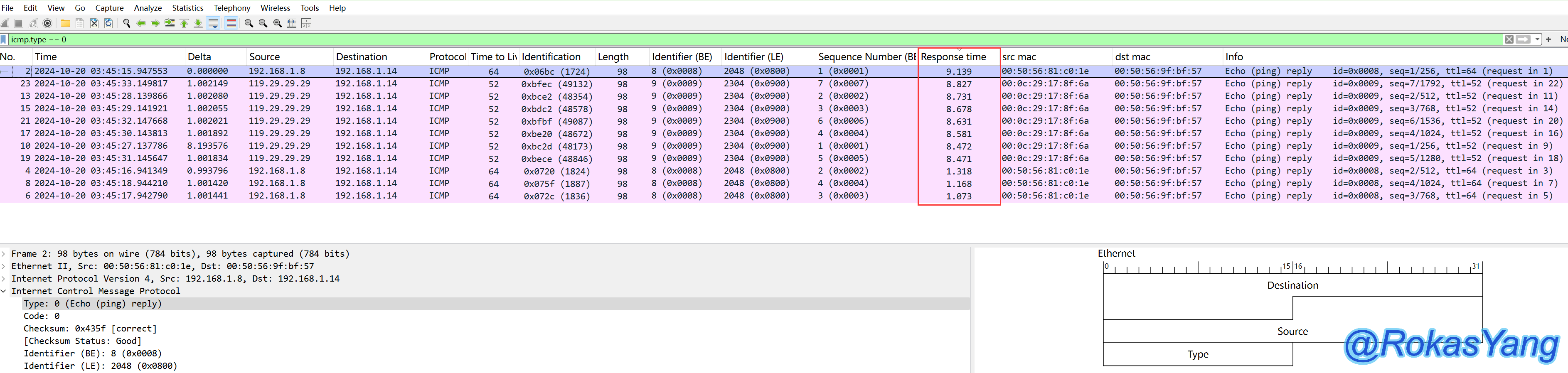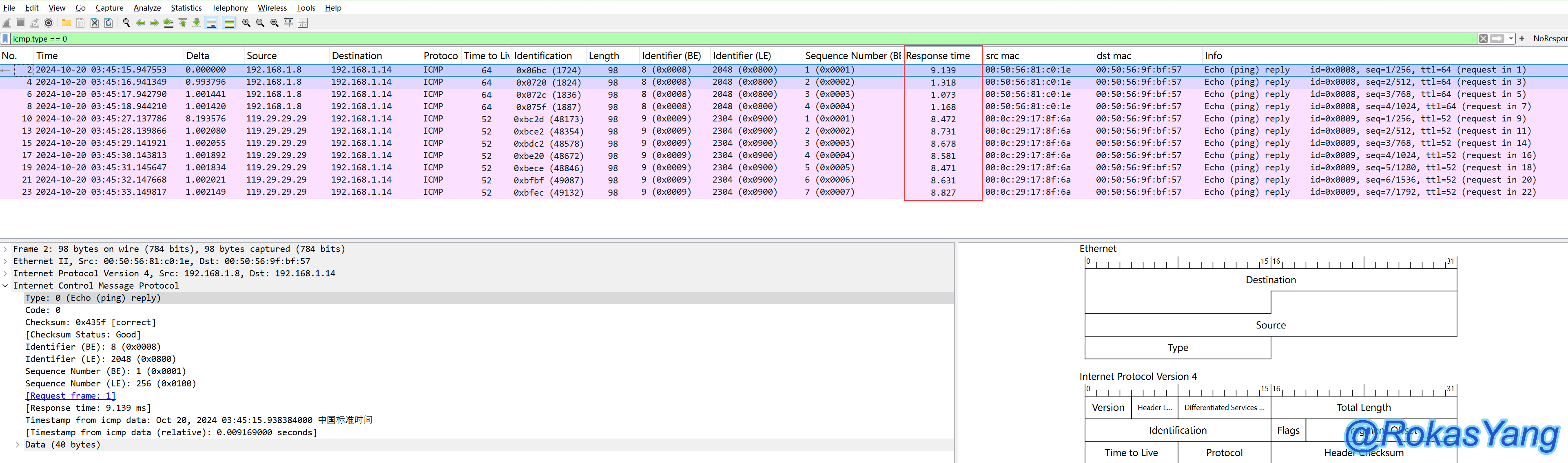 可以看到Response time字段直观列出了每个icmp响应报文的RTT耗时。
