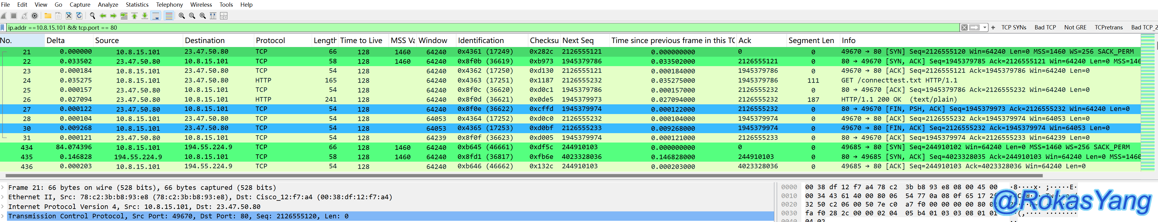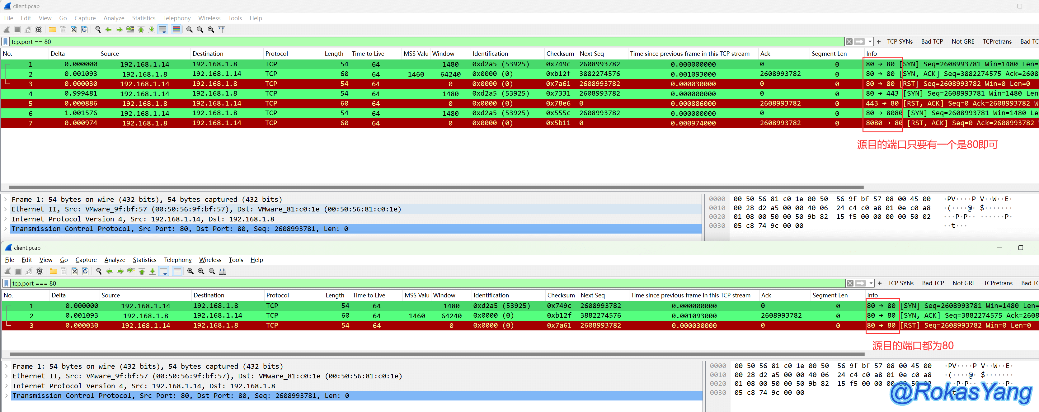 对比等于(==),不全等(!==)排除了当源目端口的都是80的情况,以帧为维度,源或目的端口,只能满足一个是80的。