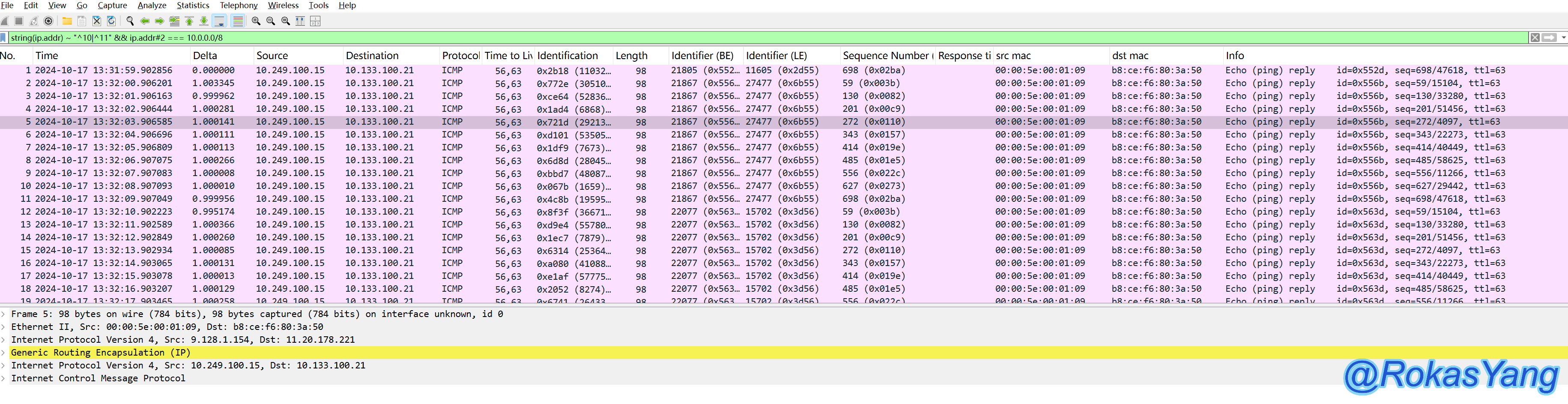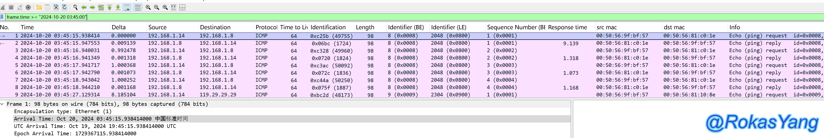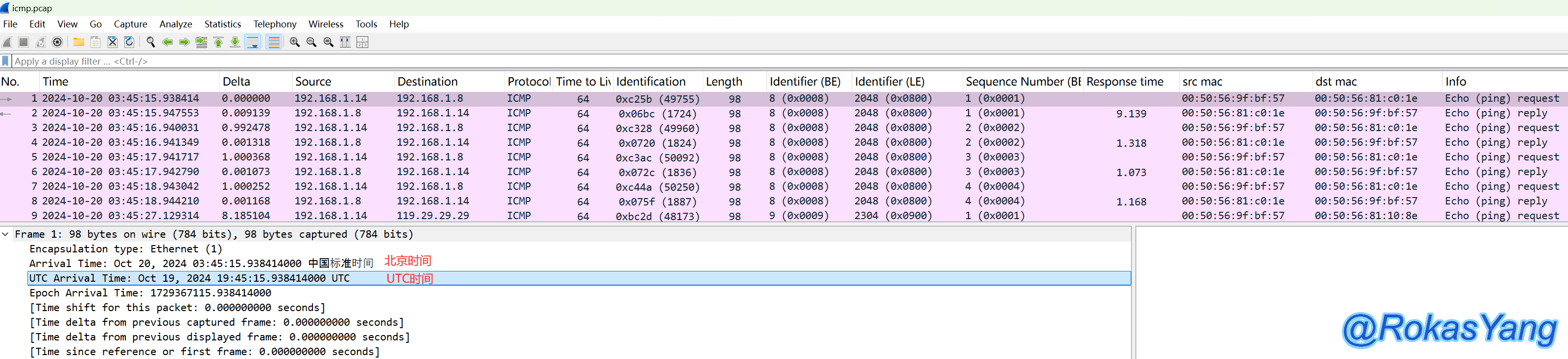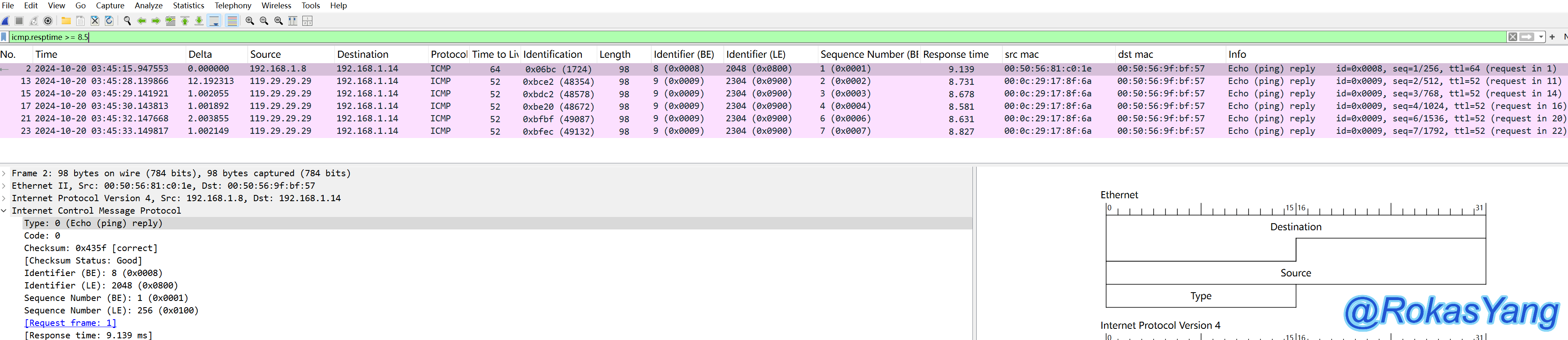 以第一条9.139毫秒的icmp reply为例,想要过滤对应的icmp request请求+reply响应报文,可以是: