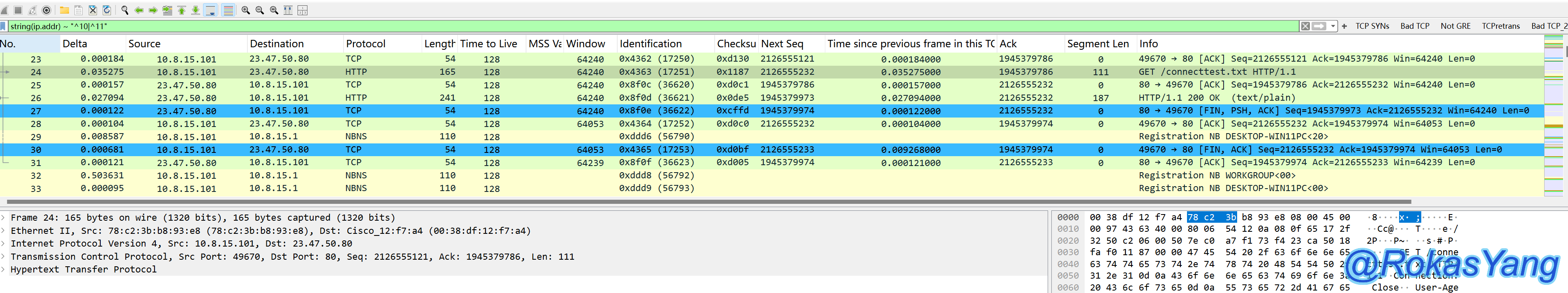 这里把外层ip.addr数据类型通过string()函数转化为了字符串,再通过匹配操作符去匹配正则表达式。