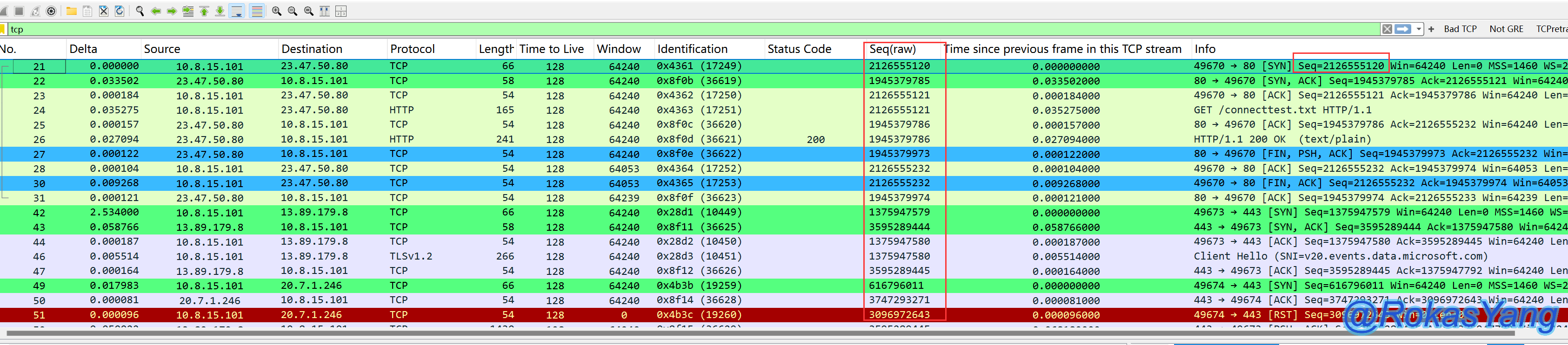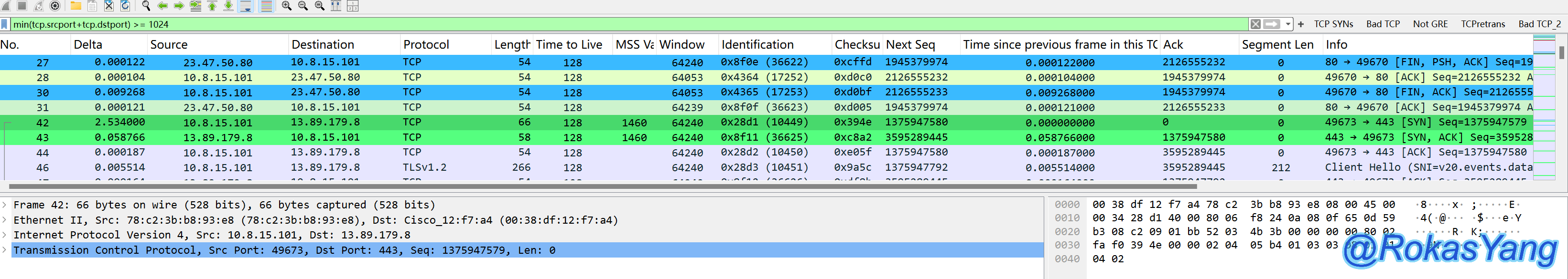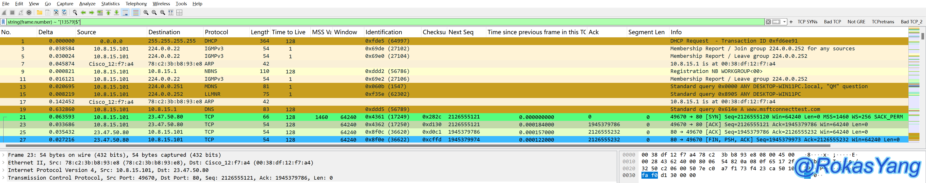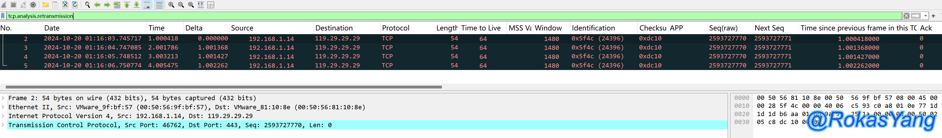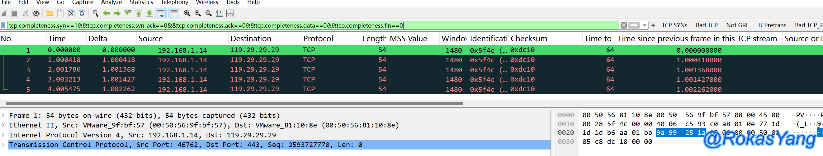 tcp.flags.syn==1 && tcp.flags.ack==0这个逻辑仅仅是以帧为维度,只要满足SYN标志位为1,并且ACK标志为0的报文,都会展示出来,没有TCP流/TCP会话的概念,某些场景可能也能过滤出来,但更推荐tcp.completeness.xxx语句,更加精准的命中需求。