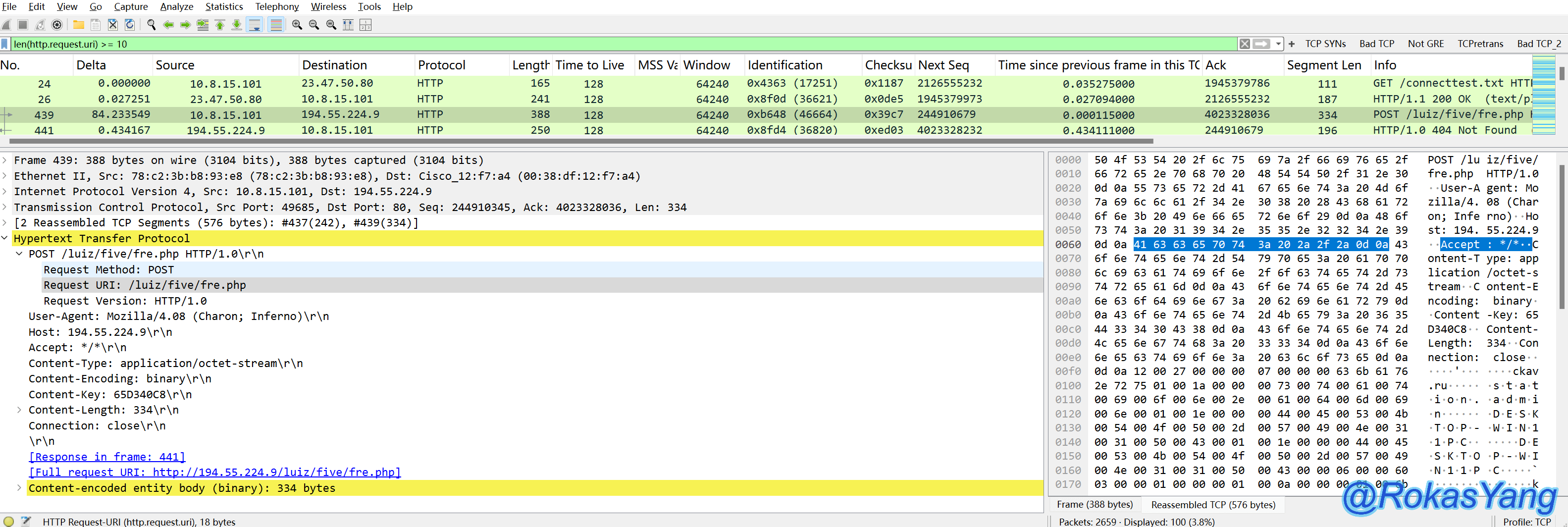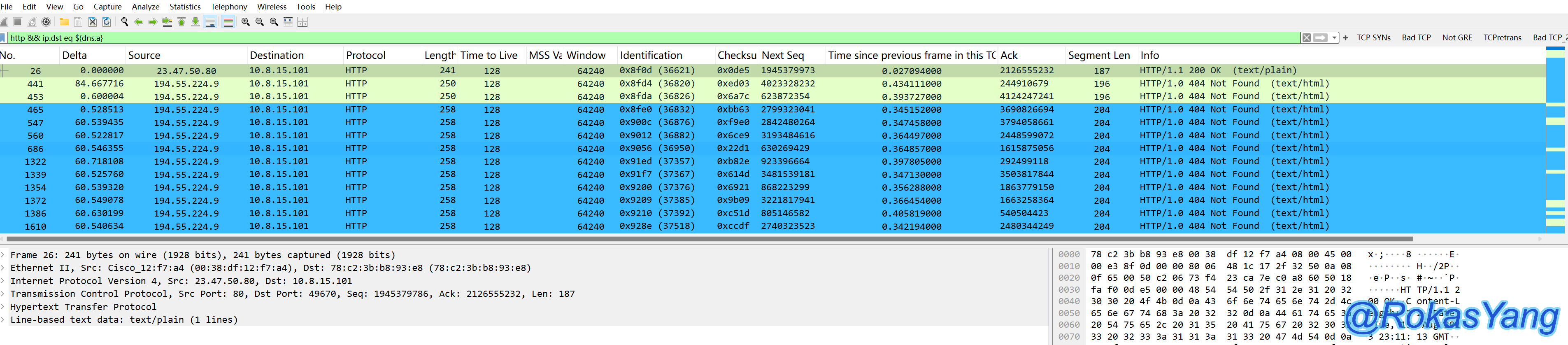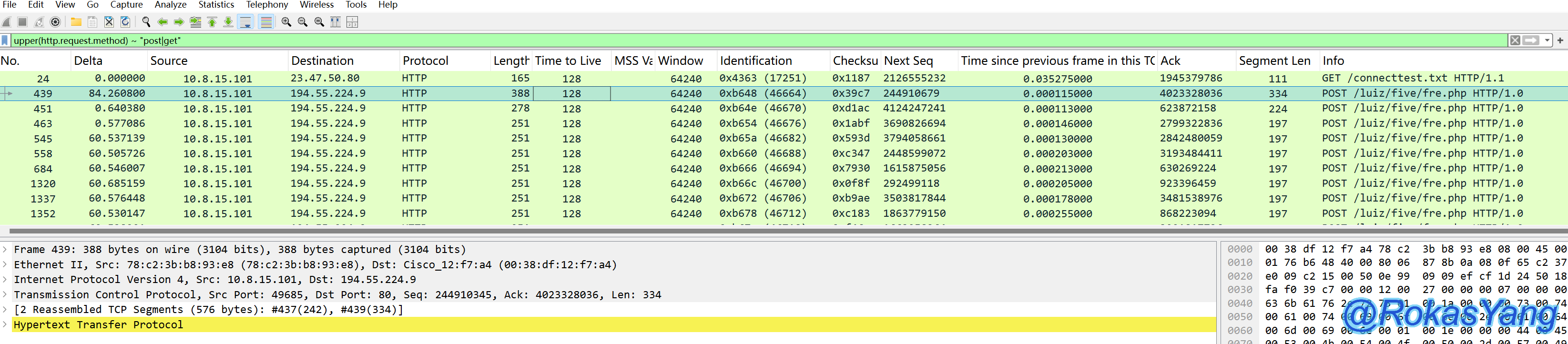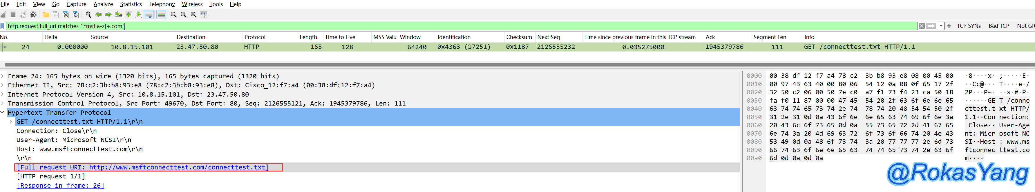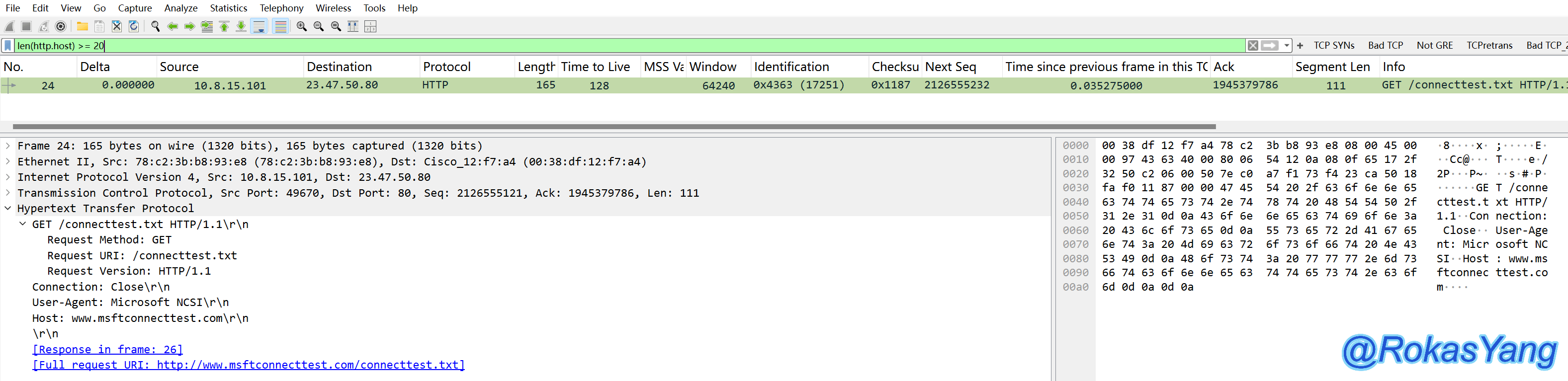 当然,把tcp替换成你想要的任何协议或字段都可以,比如:udp contains、frame contains、http contains,前提数据类型为string,所以tcp.port、ip.addr这些则用不了contains。