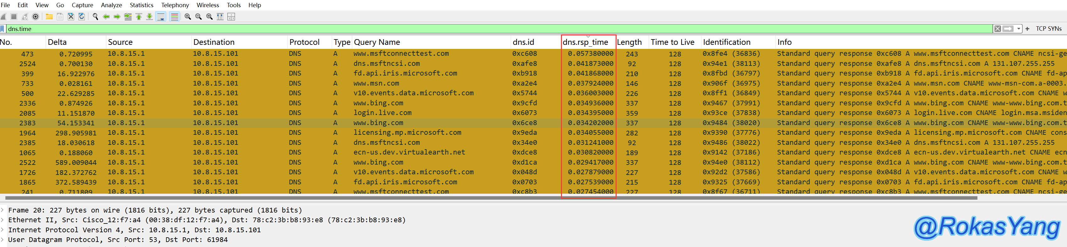 应用为列后,过滤请求可以直接写dns.time,之后单击两下我们刚新增的列: