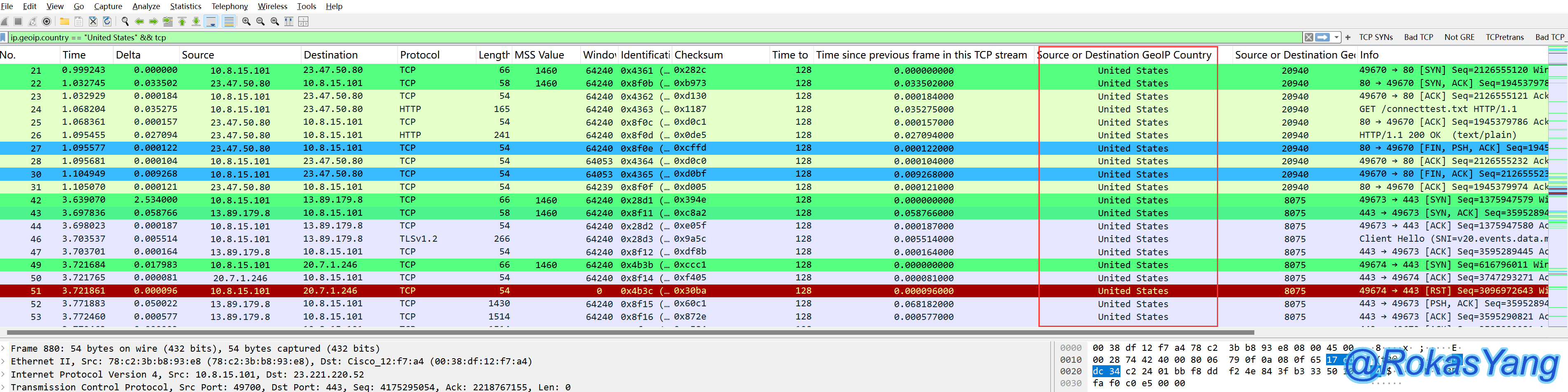 过滤指定国家的TCP报文,比如过滤IP归属地为美国的TCP报文,可以是: