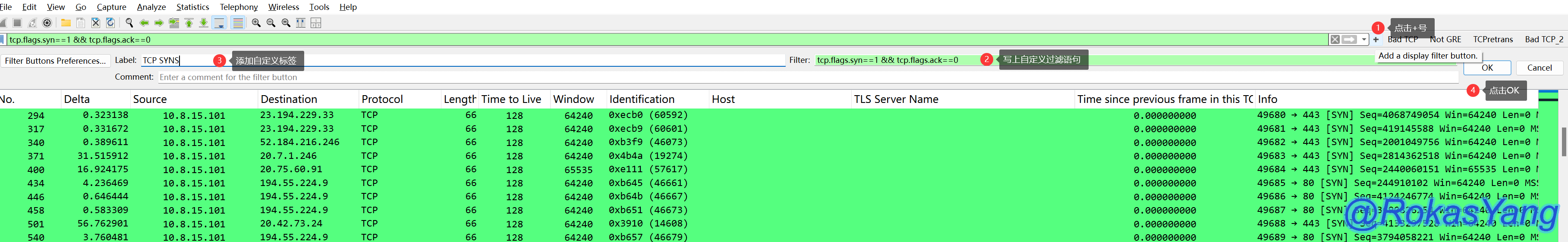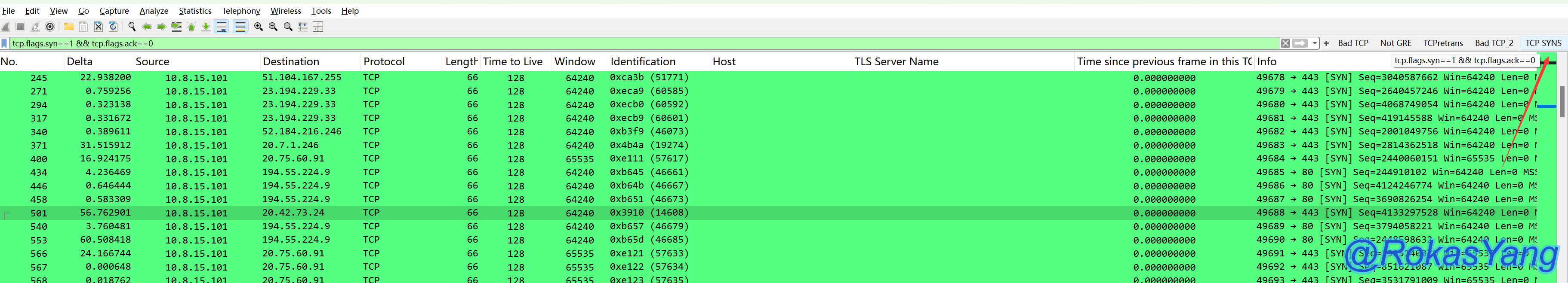 ip.addr in {192.168.1.99,10.1.1.254,10.2.1.253}再结合上面的and逻辑操作符,只筛选SYN请求的: