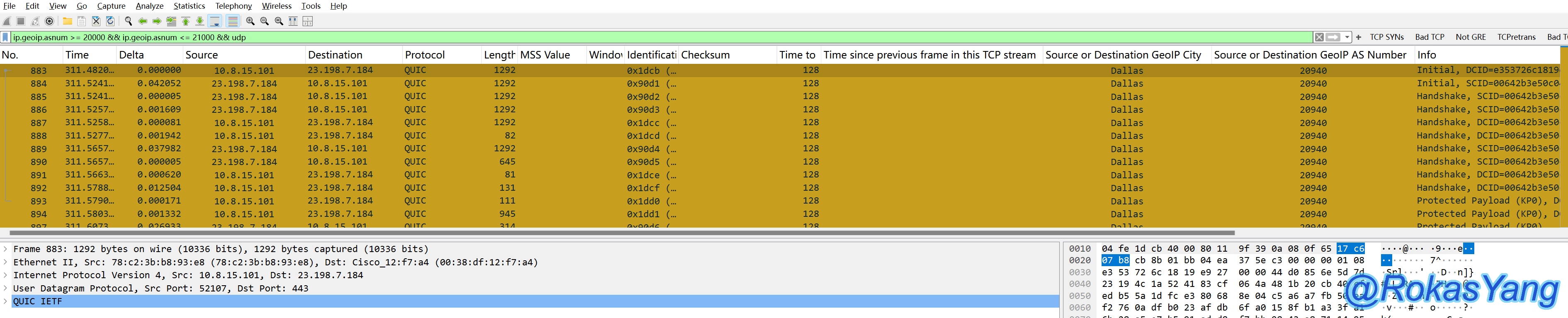 这个功能需要Wireshark配置IP地址库才能实现,如何配置可参考笔者的这篇文章,并且有更详细的关于地址库字段的过滤用法,下面只简单列举较为常用的两个实例。