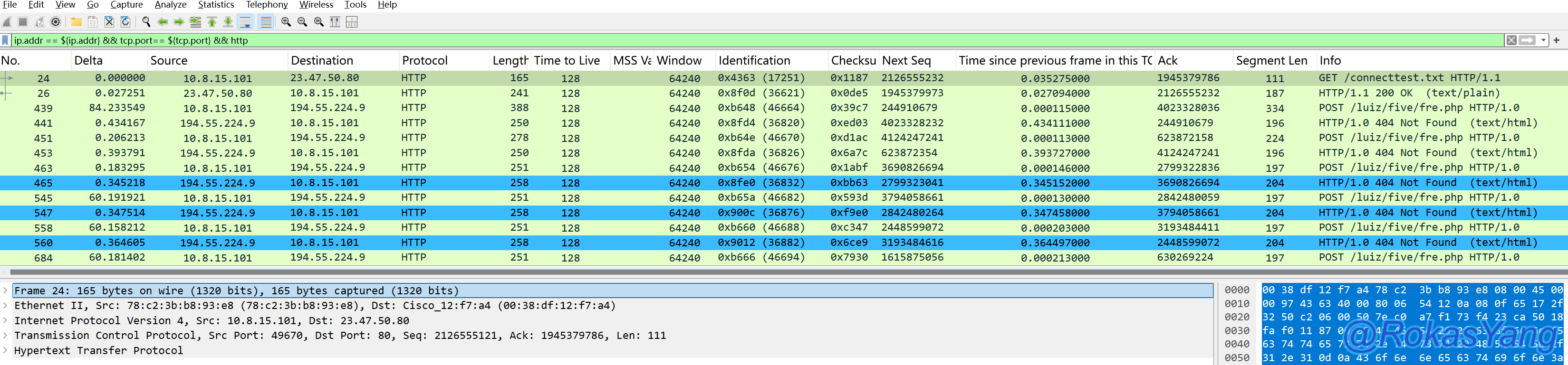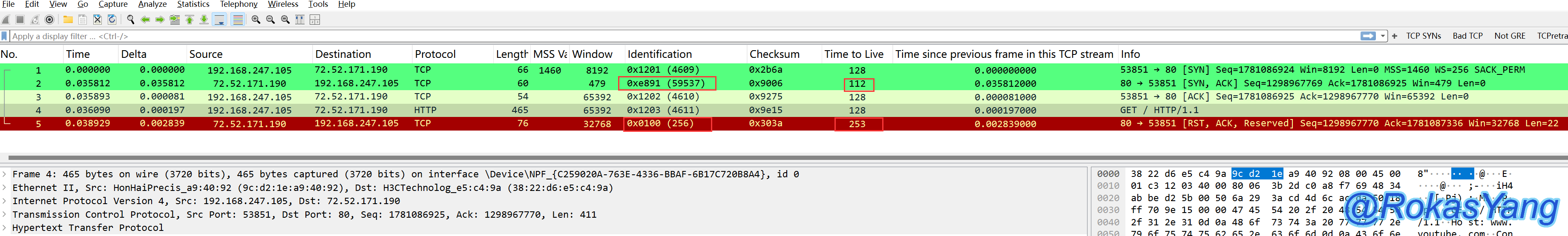 三次握手成功建立,此时客户端发送GET请求,对端响应了RST-ACK断开连接,同时,对端发送的SYN-ACK的TTL是112,ip.id为99537,而RST-ACK的TTL突然变成了253,ip.id变成了256,很明显,这个RST-ACK报文并不是对端主动发送的。那么会是谁发送的?有几种可能: