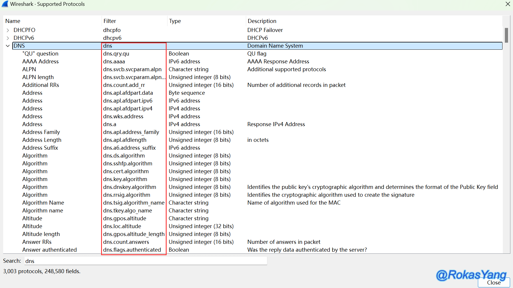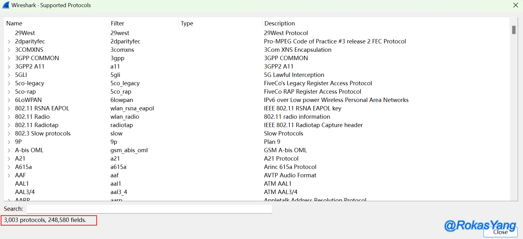 在 视图(View) --> 内部(Internals) --> 支持的协议(Supported Protocols)即可查看支持的所有协议,在搜索框中键入你想要搜索的字段: