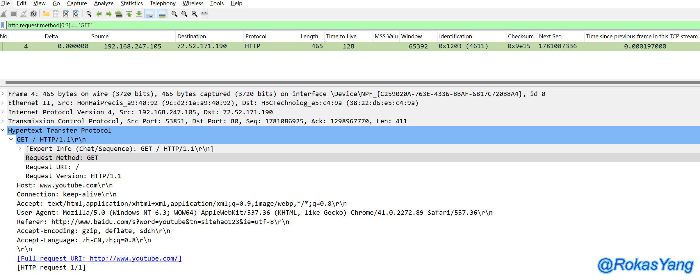 比如下面这个示例,过滤http请求方法,前三个字符为GET的报文: