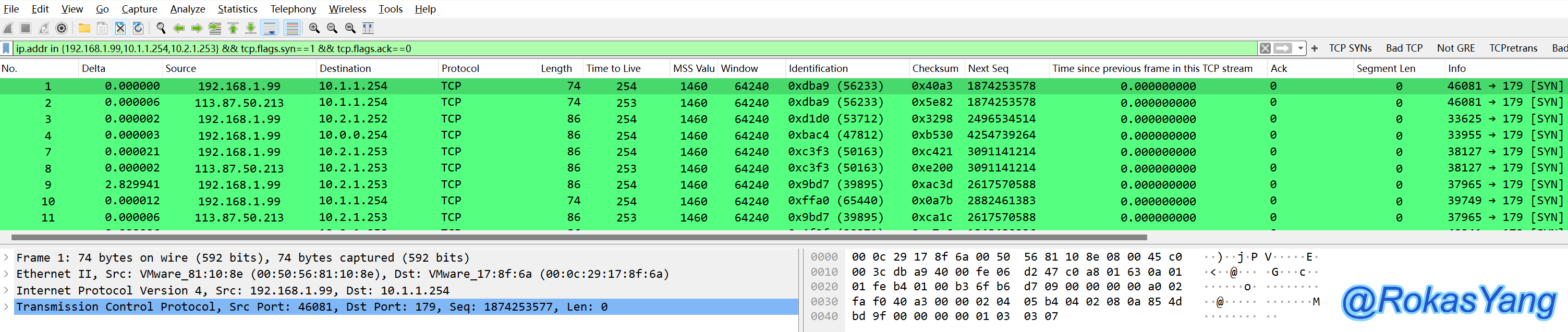 ip.addr in {192.168.1.99,10.1.1.254,10.2.1.253} && tcp.flags.syn==1 && tcp.flags.ack==0