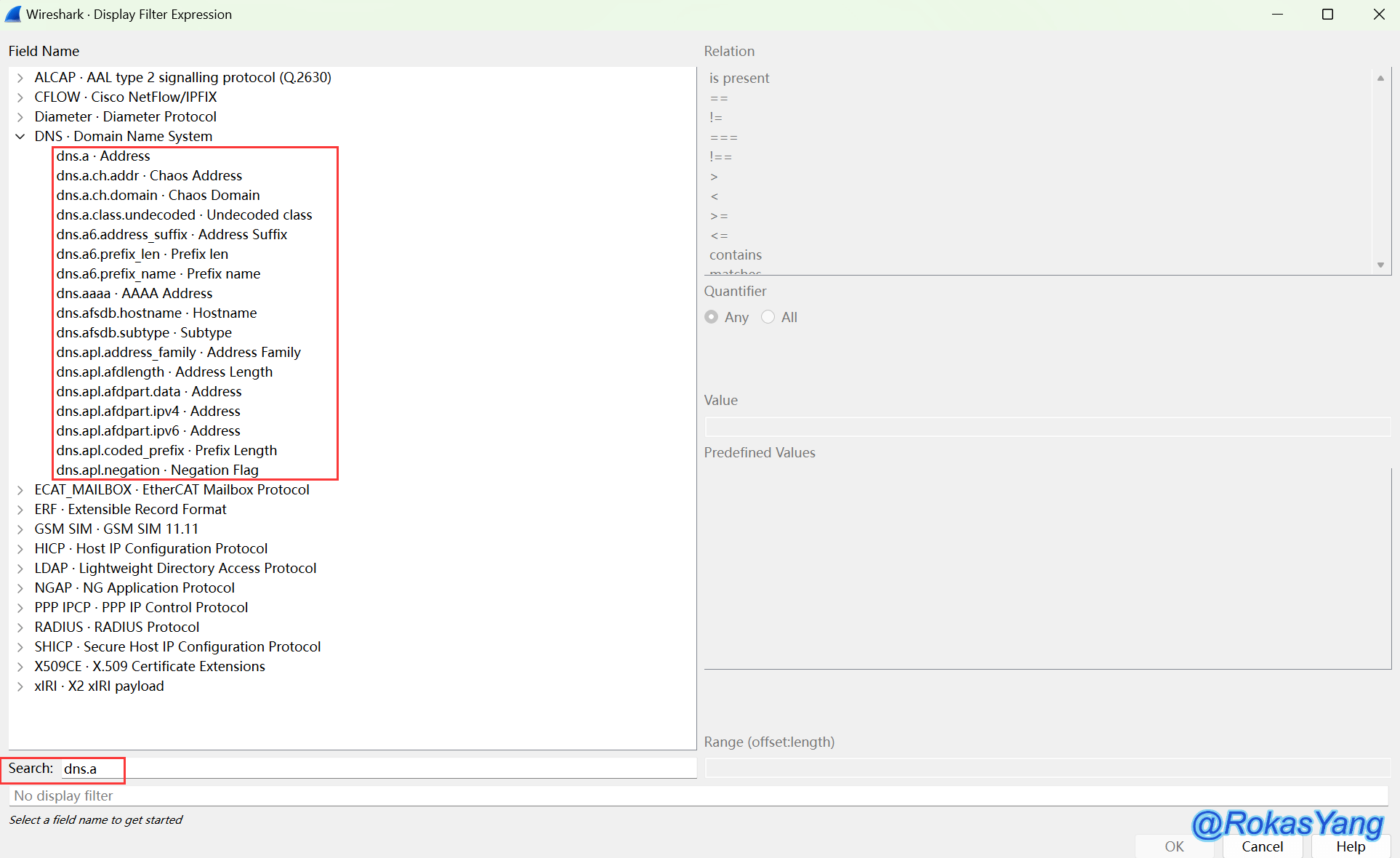 将会展示所有匹配的协议字段,即使协议子字段能匹配搜索的内容也会展示出来,比如搜索dns,注意不要回车,等待几秒后将会输出结果: