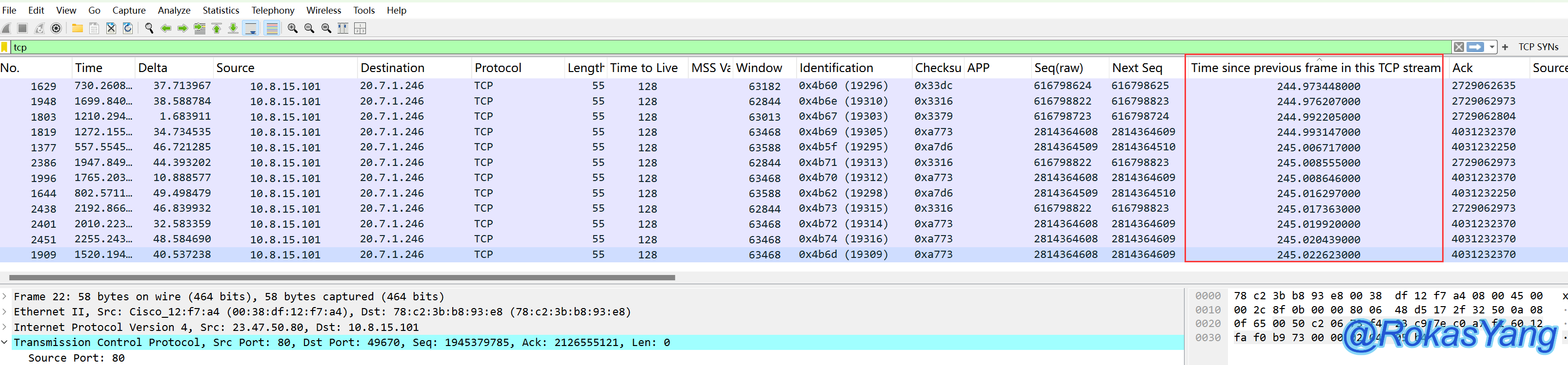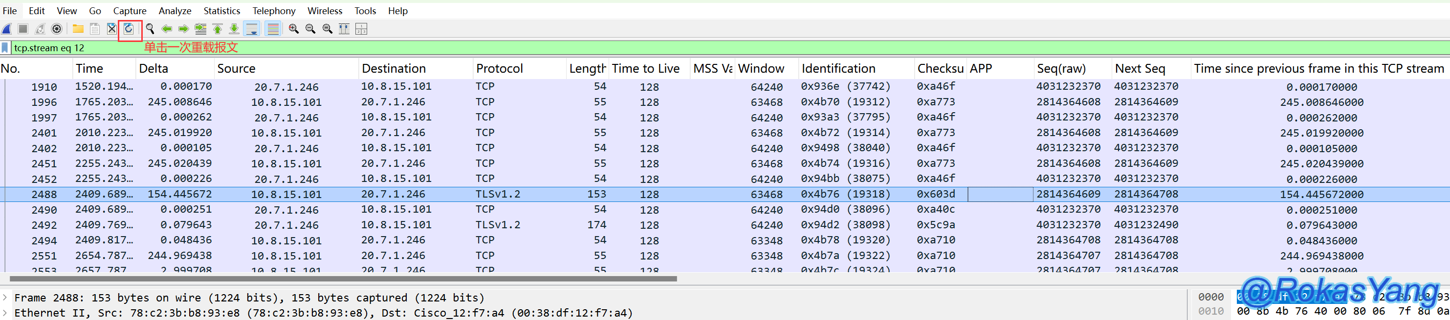 找到耗时异常的帧并右击追踪流后,别忘了将报文重载,让它恢复报文顺序: