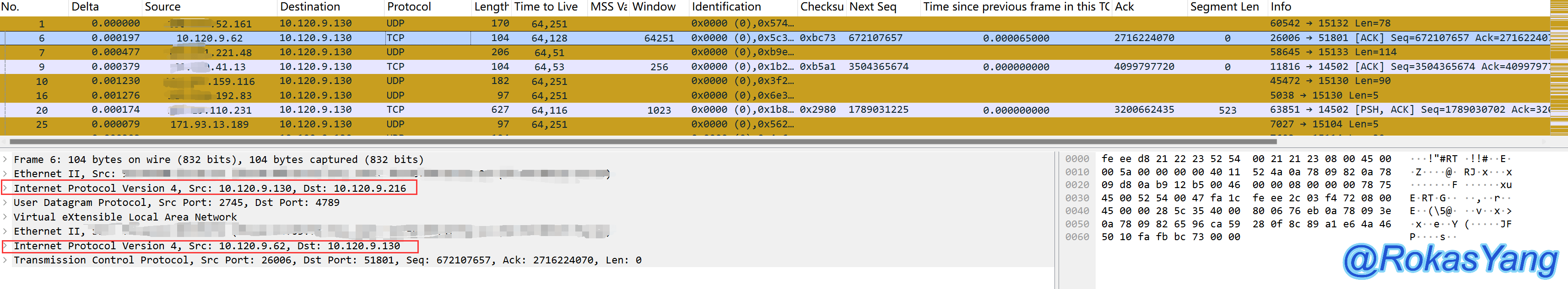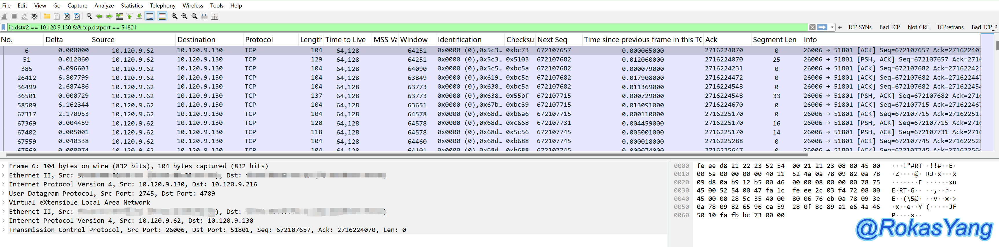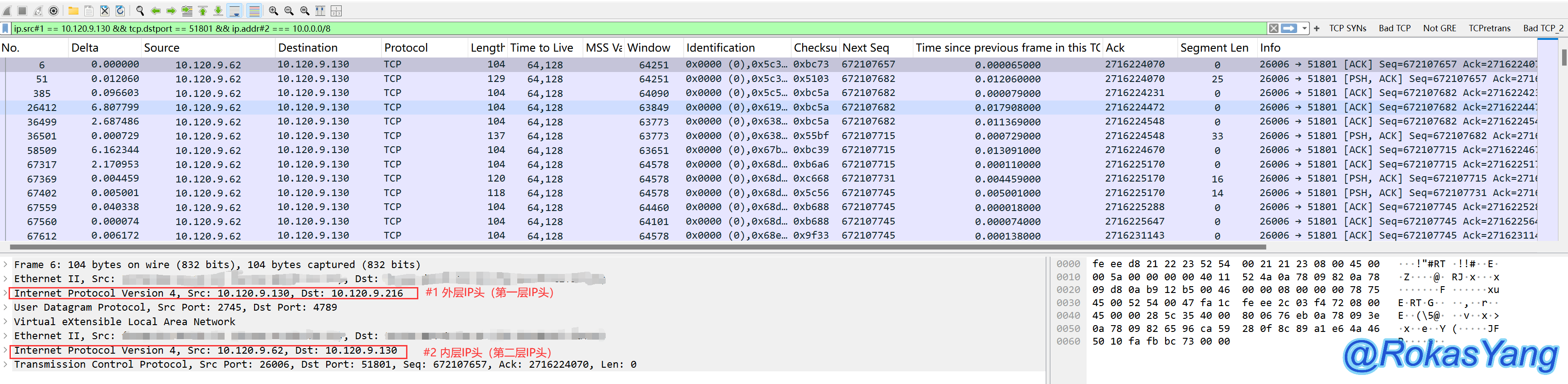 此时想通过过滤内层(第二层)的IP,那么可以加上层级操作符#2,比如过滤内层IP为10.120.9.130的包,并且tcp目的端口为51801的报文,可以这么写: