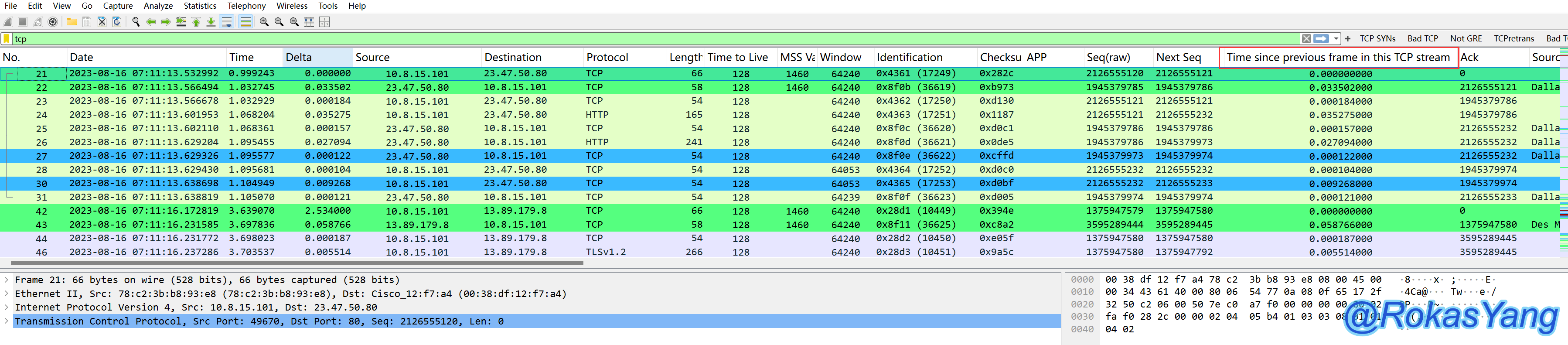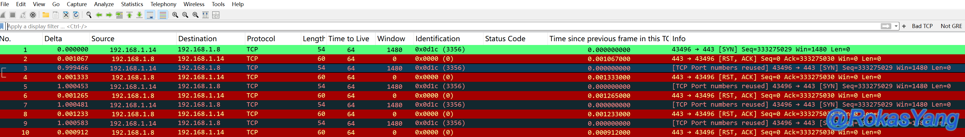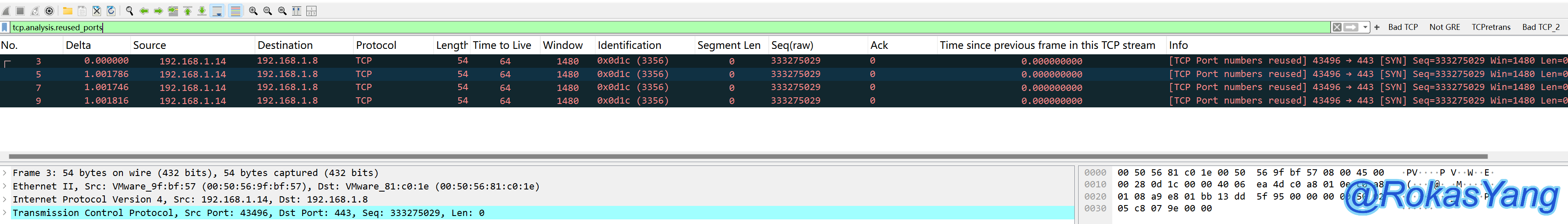 基于这个定义,那么即使一个报文中,TCP stream 1的SYN使用了一组源目的IP和端口,而这个包的TCP stream 100的SYN也使用了这组源目的IP和端口,即使这两条流相差十万八千里,哪怕一年十年间隔之久,只要出现在同一个抓包文件里面,Wireshark就能根据定义,把后面出现的TCP stream 100的SYN标记为端口复用。