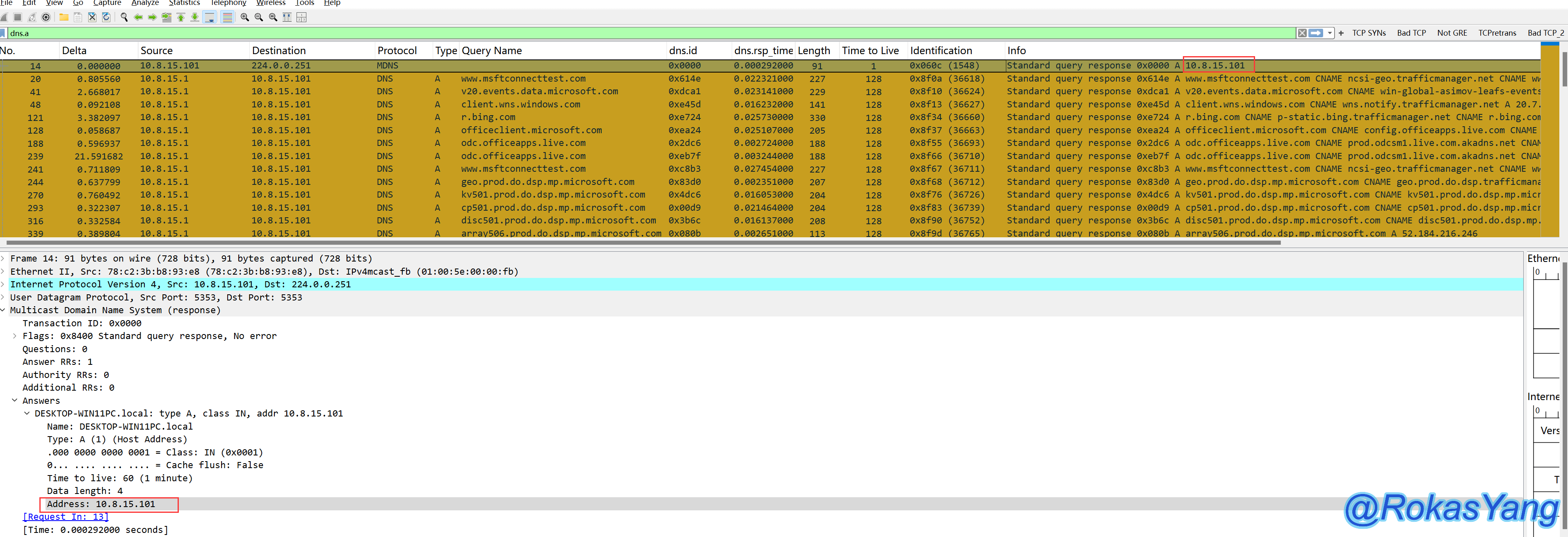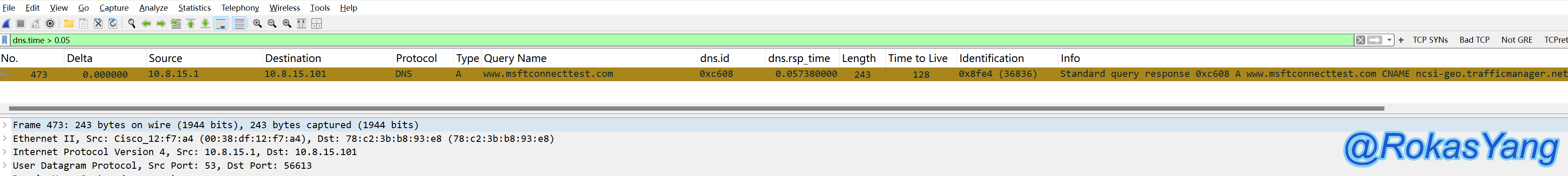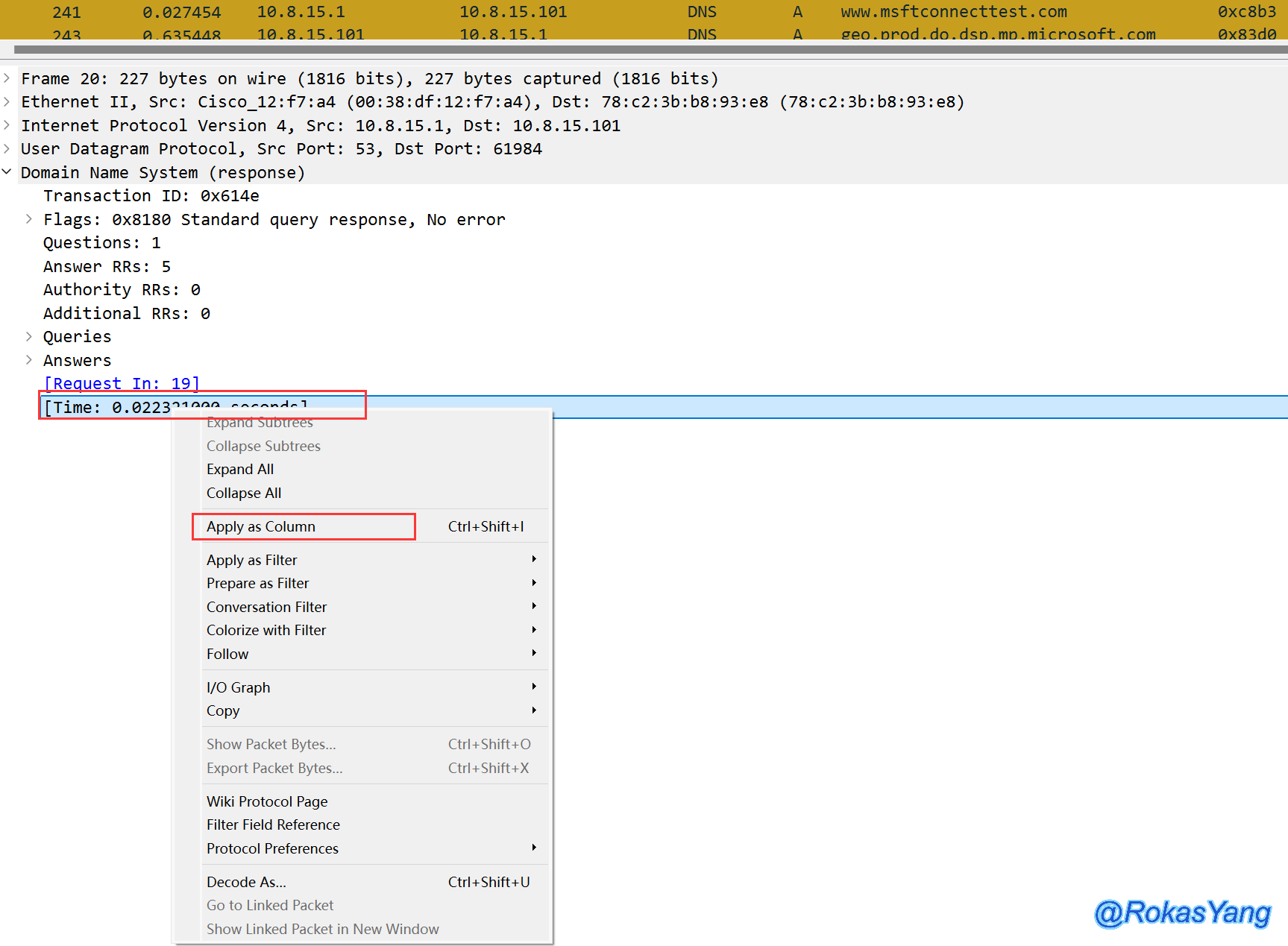 首先找到一条dns response的报文,展开后找到最底下的dns.time字段,右击应用为列,如何操作也可参考上面 2.9 节。
