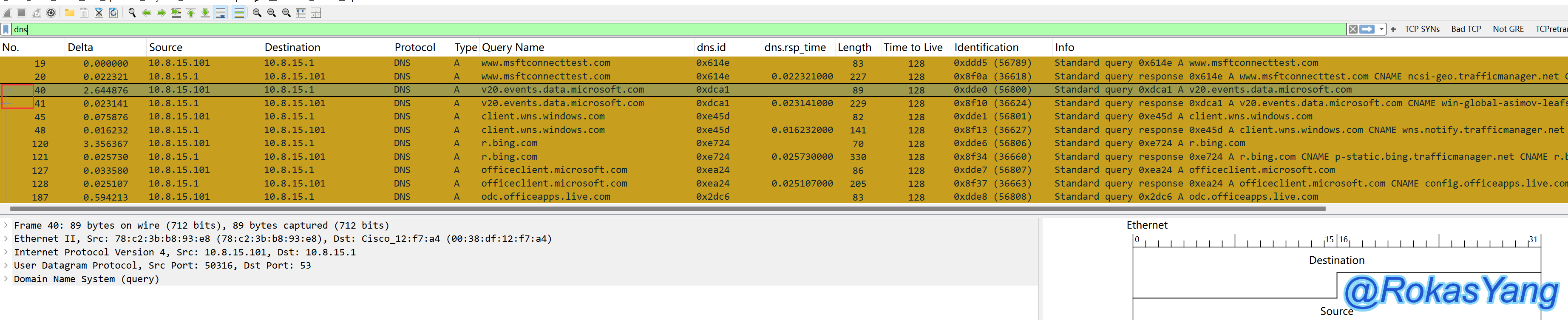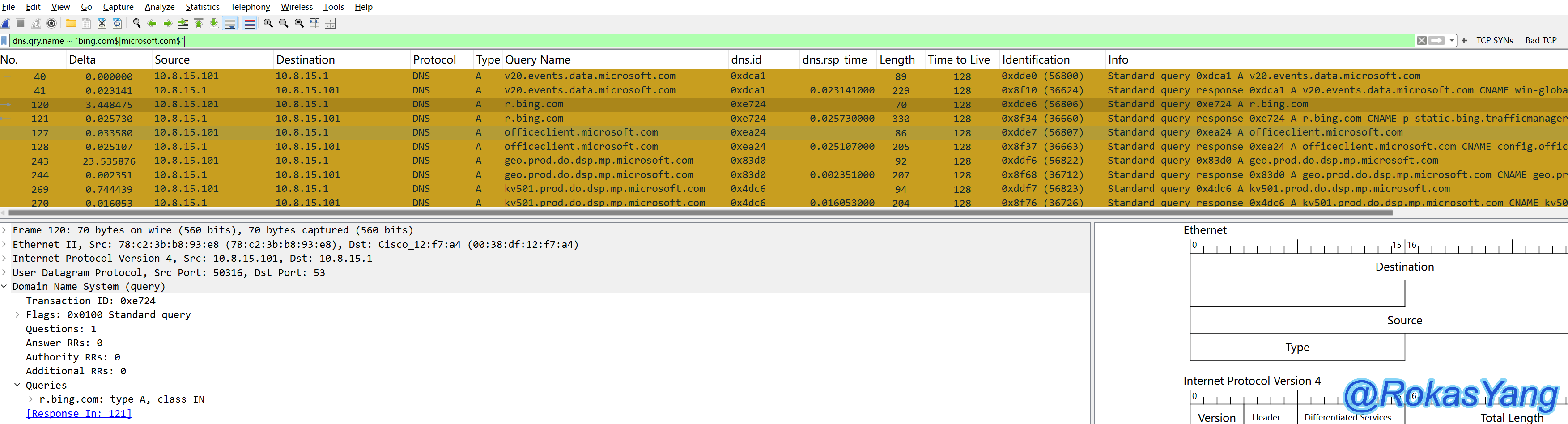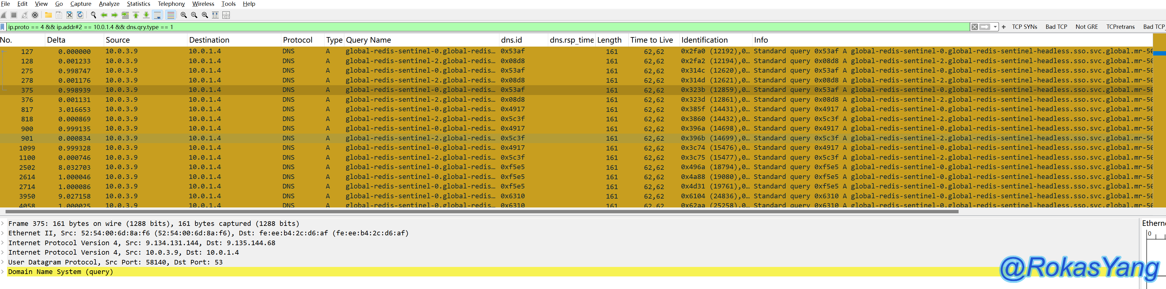 可以根据dns.id字段来跟踪一条DNS请求和对应的响应,比如追踪如下两个dns.id字段: