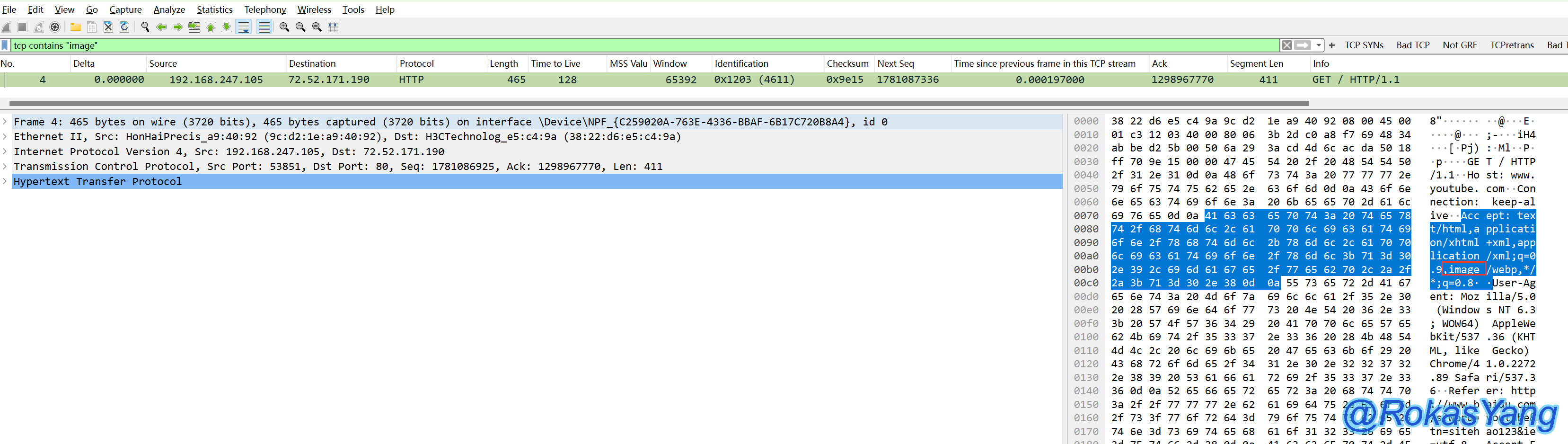 比如tcp连接中,包含字符串"image"的请求,过滤方式可以是: