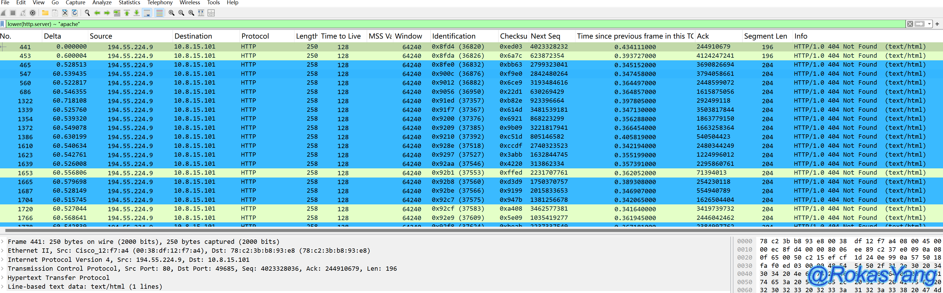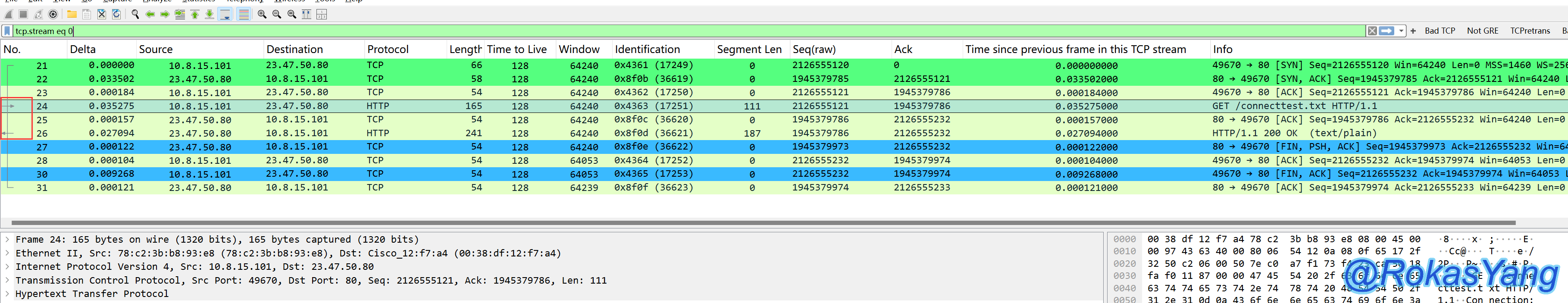 如果不看箭头符号,并不好直观看出哪个帧是HTTP请求,而Wireshark则默认标记出来了,第4帧是请求,第11帧是响应,前提是鼠标要选择请求帧或响应帧,Wireshark才会给你完整标记出请求帧和响应帧。