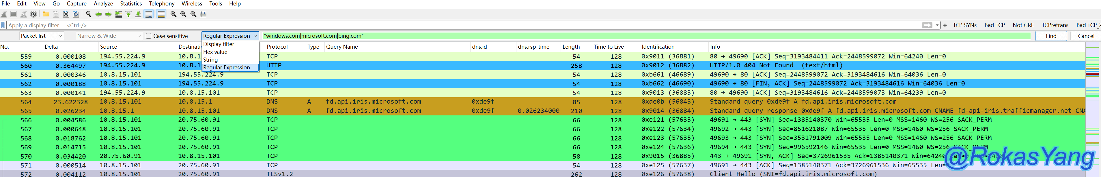dns.qry.name == "cloud.tencent.com"因为这个字段数据类型属于字符串类型,再配合前面讲到的正则匹配,匹配满足要求的多个域名,可以是: