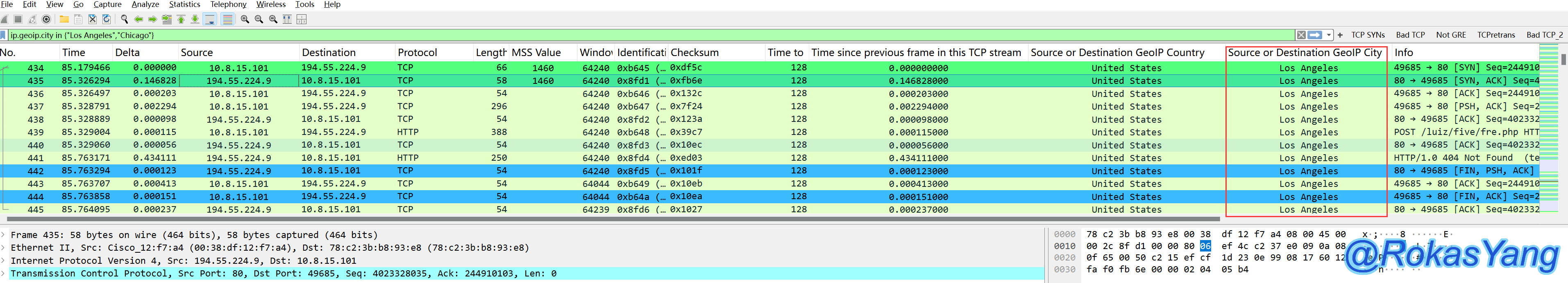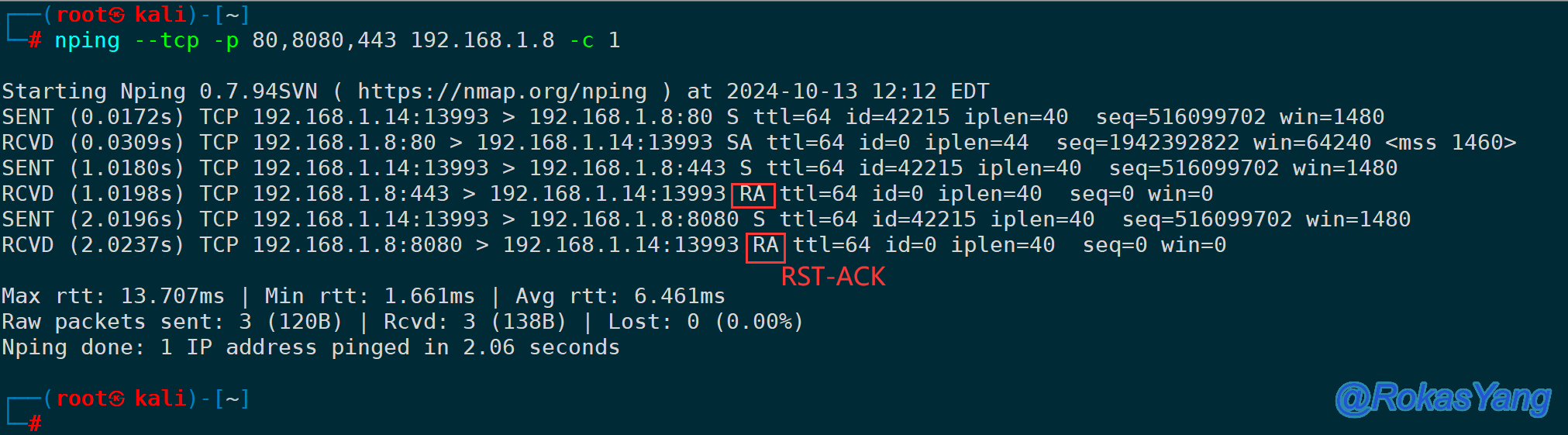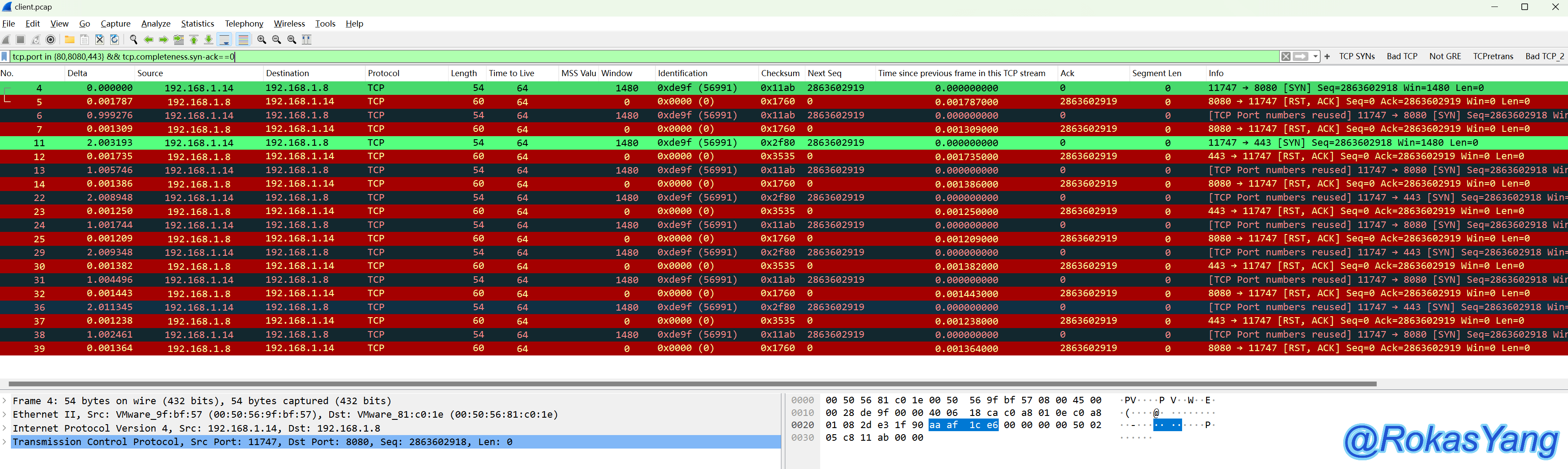 可以看到只有443、8080端口符合筛选条件,测试的对端服务器没有监听这两个端口,所以响应了RST-ACK。