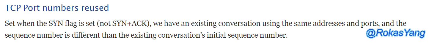 即当一个抓包文件中,SYN标志位的报文(不包含SYN-ACK),有一个使用相同地址和端口的现有会话,seq与现有会话的初始seq不同时,会将此SYN报文标记为端口复用。