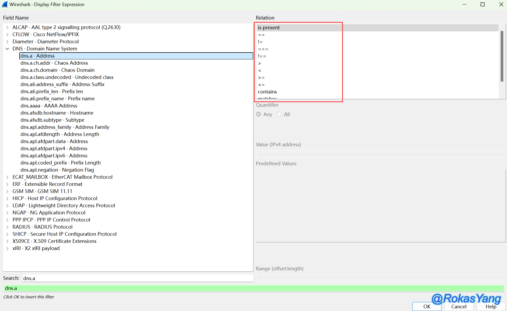 eq | any_eq | == | 等于 | ip.src == 10.0.0.5 |