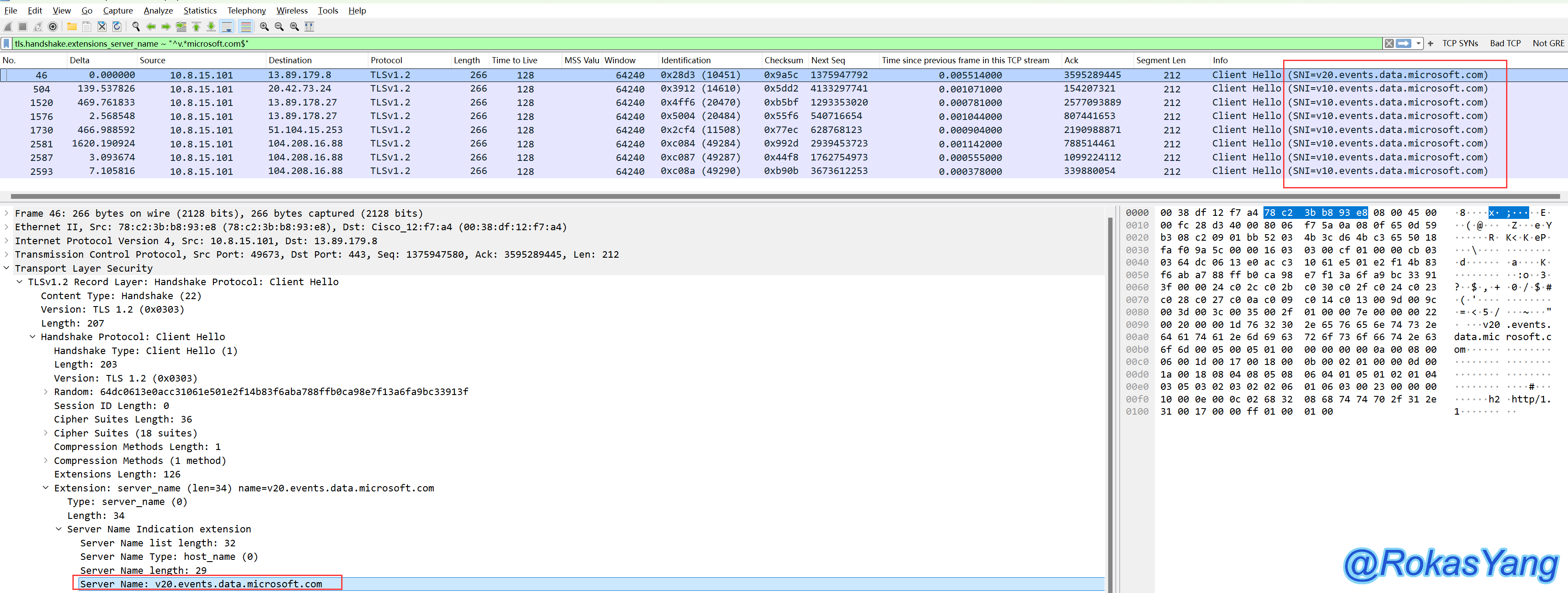 示例2,过滤TLS握手中client hello阶段的域名,必须以v字符开头,microsoft.com结尾的报文: