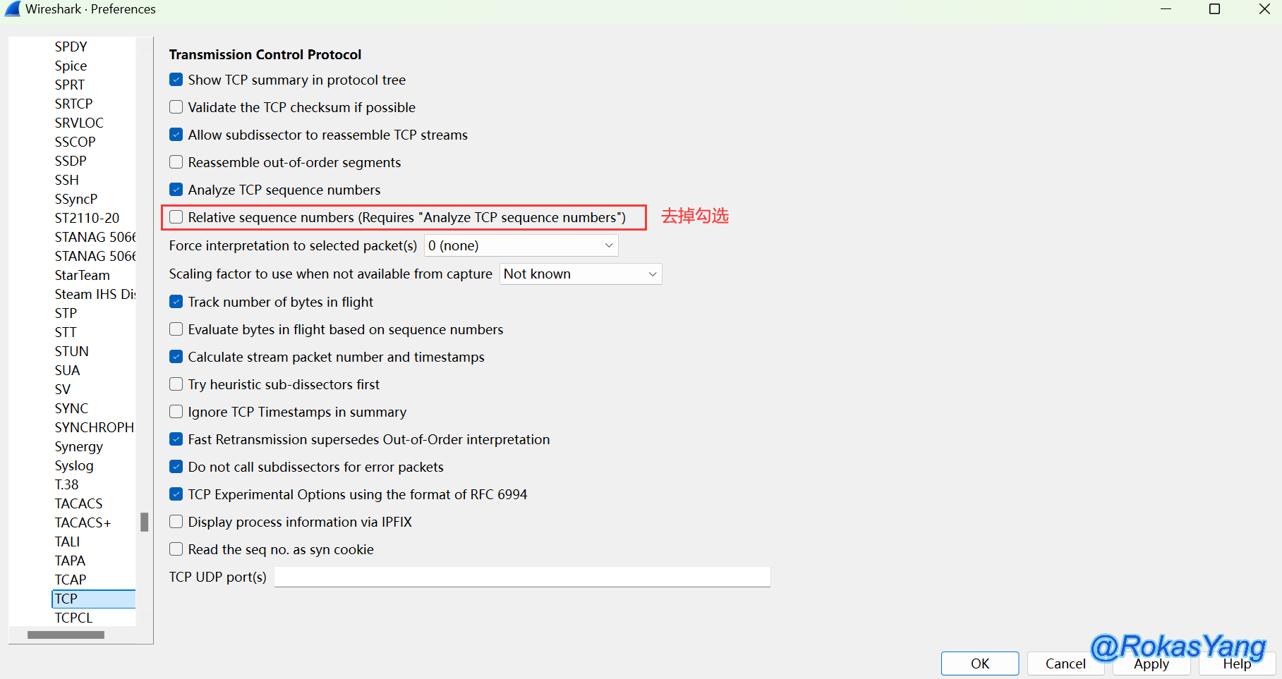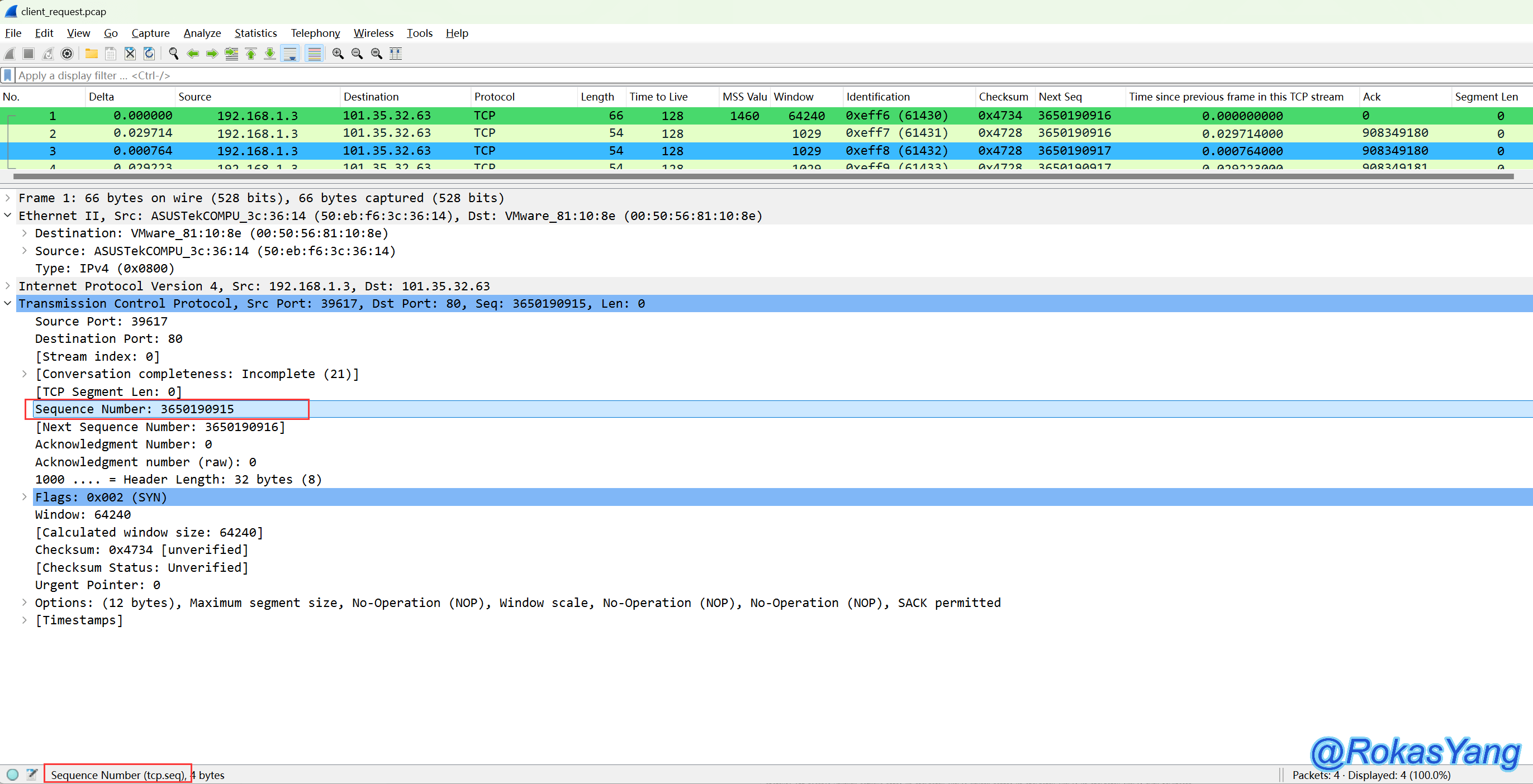 将报文展开后,你鼠标所点击的任何字段,都能作为过滤条件,比如鼠标点到Sequence Number这个字段,最下面左下角会展示对应的字段过滤语法: