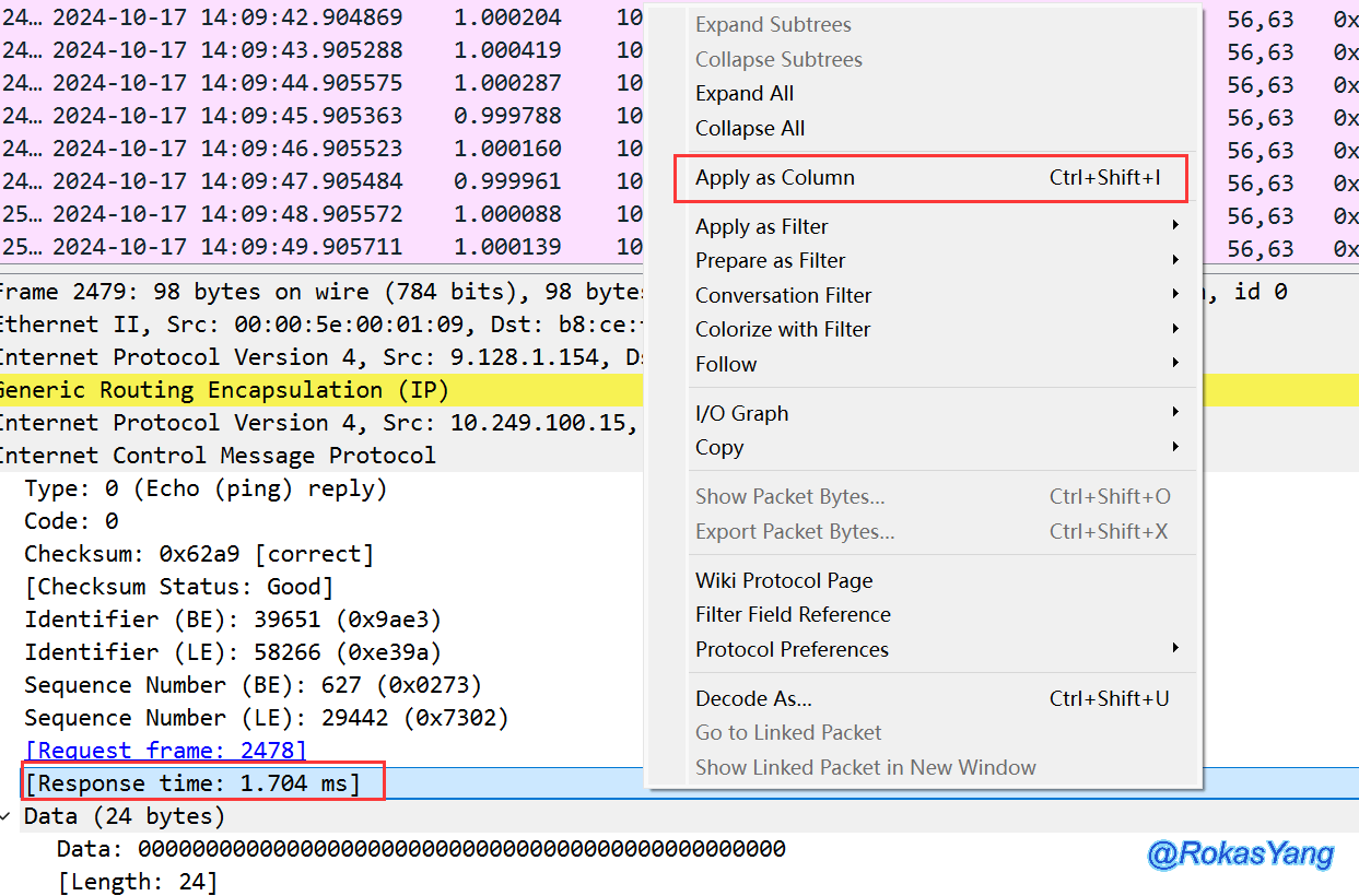 首先将ICMP响应耗时字段应用为列,如何操作可参考上面 2.9 部分。