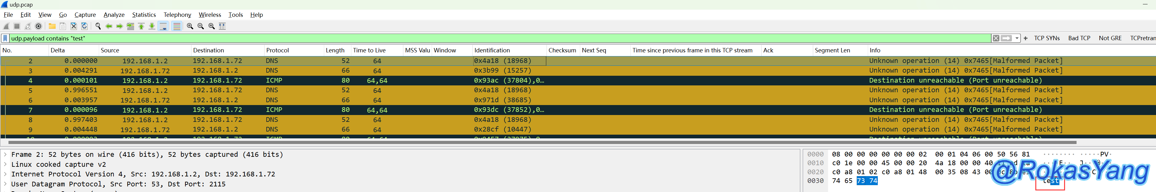 又或者直接过滤Payload的数据,比如nping发起一个UDP的协议探测,发送一个测试字符串"test":