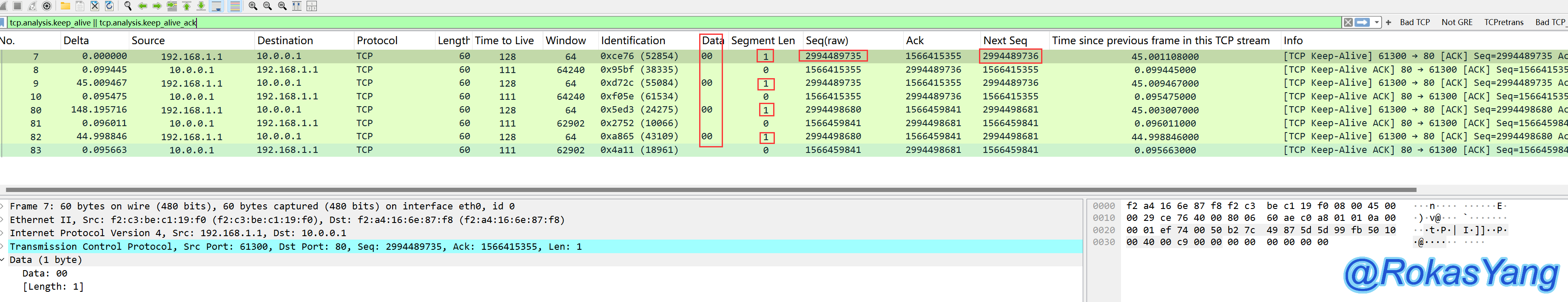 可以看出,过滤出来的keep-alive包均同时满足上面三个条件,段长度为1的情况下,填充的数据是0,对应十六进制0x00,表示这是一个空的数据段。为什么设置为1?TCP协议要求每个数据段至少包含1个字节的有效载荷,设置长度为1字节确保了探测包满足这一要求,既节省了开销,又达到了刷新会话保活时间的能力(这里要和HTTP Keep-Alive的长连接区分开来)。