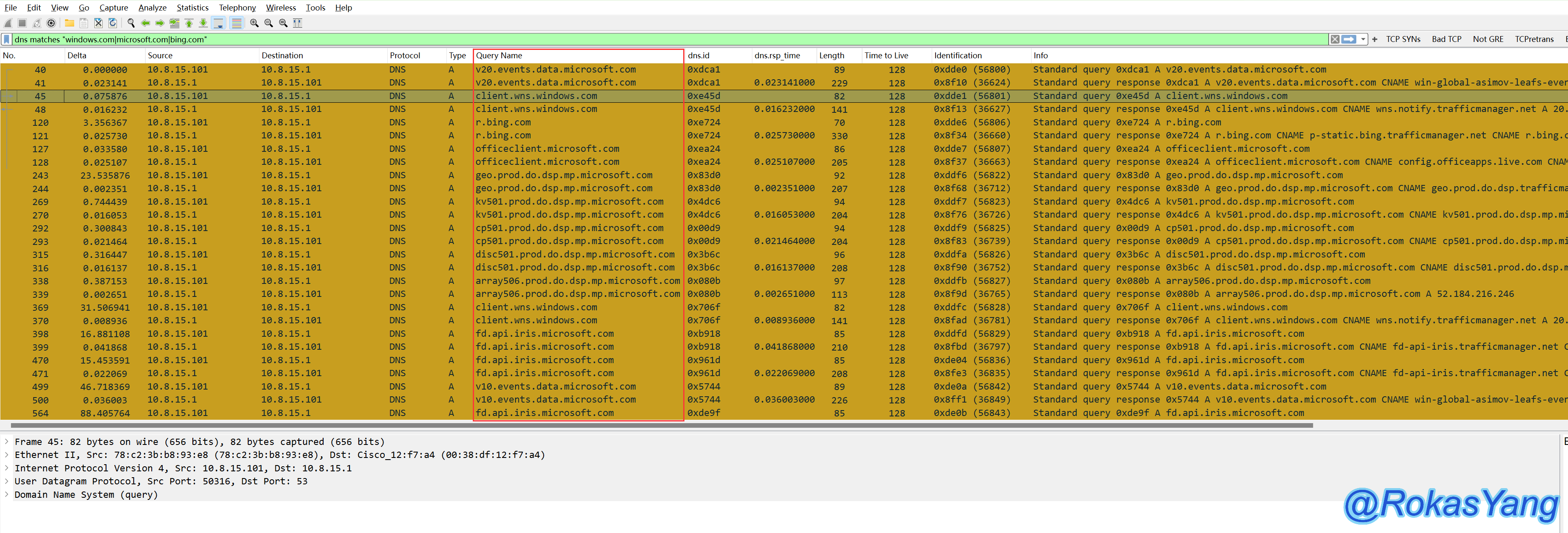 dns matches "windows.com|microsoft.com|bing.com" #dns写成dns.qry.name也是没问题的