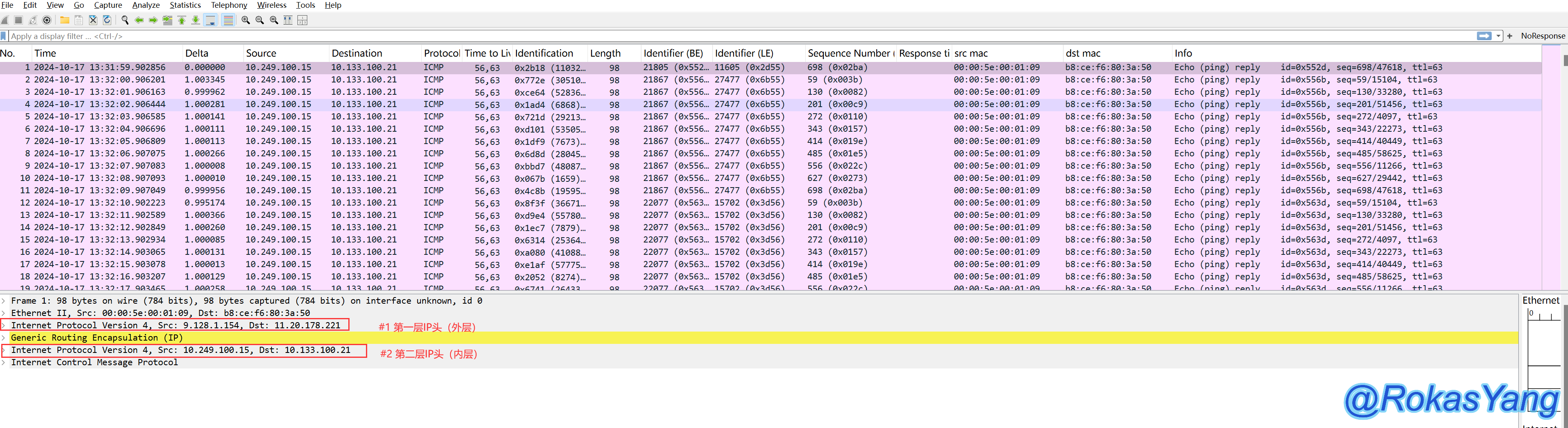 GRE的封装同理,比如下面这个报文,GRE也封了一层IP头,再加上原始报文自带的IP头,因此出现内网两层: