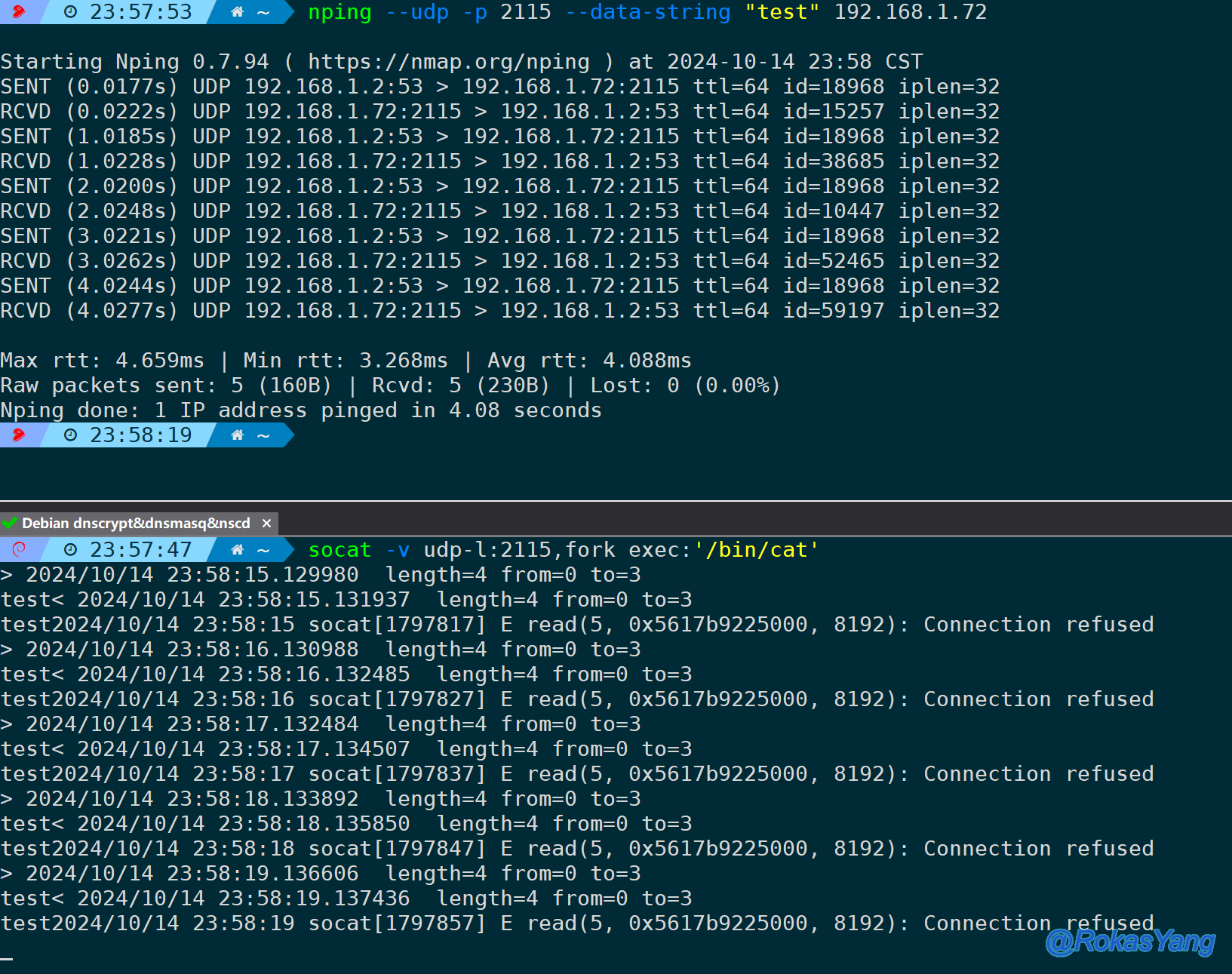 nping --udp -p 2115 --data-string "test" 192.168.1.72服务端监听2115 udp端口,并且收到什么回显什么: