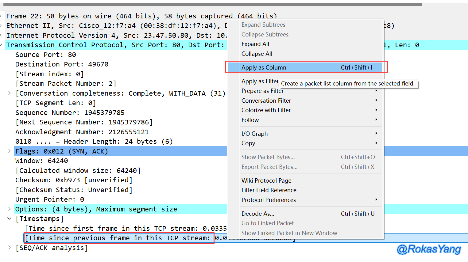 tcp.analysis.retransmission && tcp.time_delta >= 0.2首先点选任意一个TCP帧,找到时间戳字段,右击"Time since previous frame in this TCP stream"字段(含义为在TCP流中相对上一帧的时间) --> 应用为列(Apply as Column):