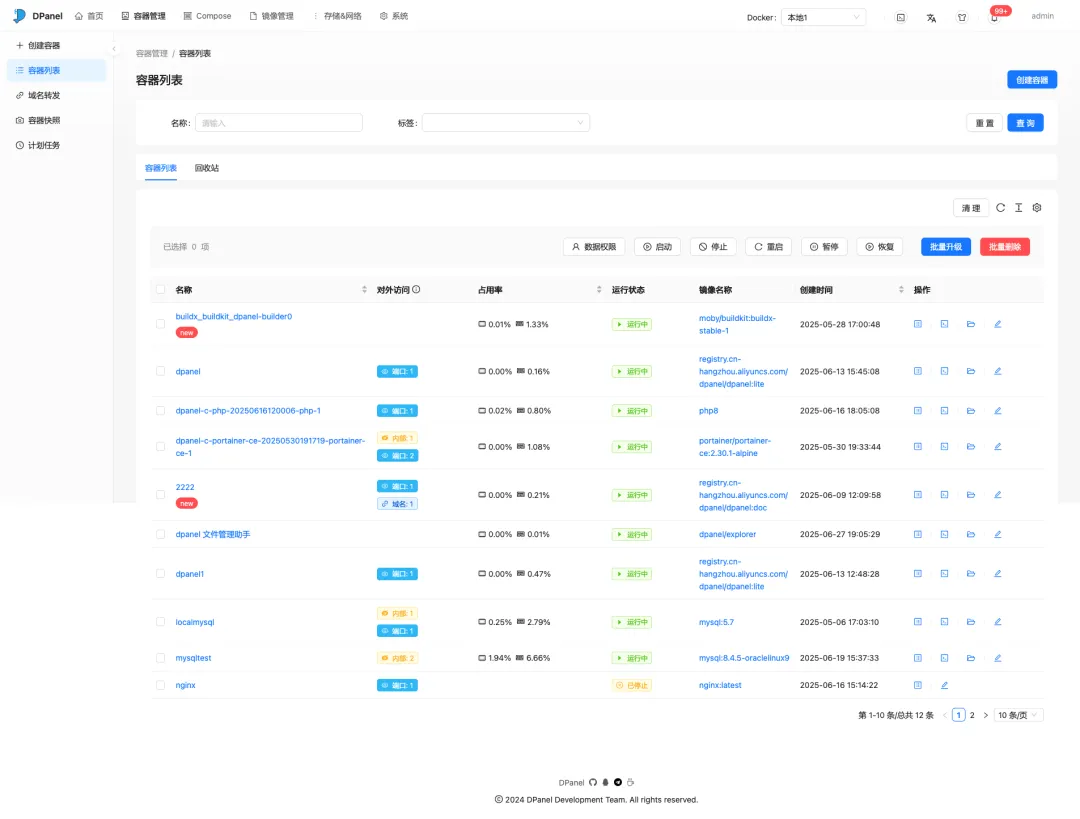 DPanel 是一款开源、轻量化的 Docker 可视化管理面板,原生的中文的界面,更适合中文环境使用。同时支持英文、日文等多种语言。安装简单,占用资源极低,更适合各种 Nas 设备、盒子以及小型服务器。面板以容器的方式运行,不需要特权,对宿主机没有依赖及侵入,安全可靠。面板提供了容器、Compose、镜像等容器管理的基础功能。