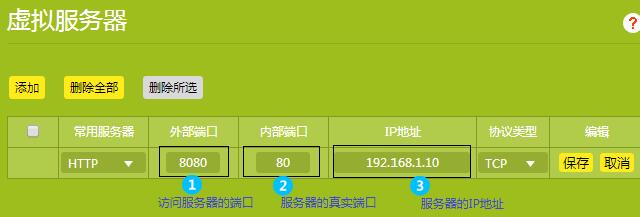 注意:外网用户访问服务器的时候使用外部端口,该端口可以与内部端口一致。如果外部端口不能自定义的,则表示它与内部端口是相同的。